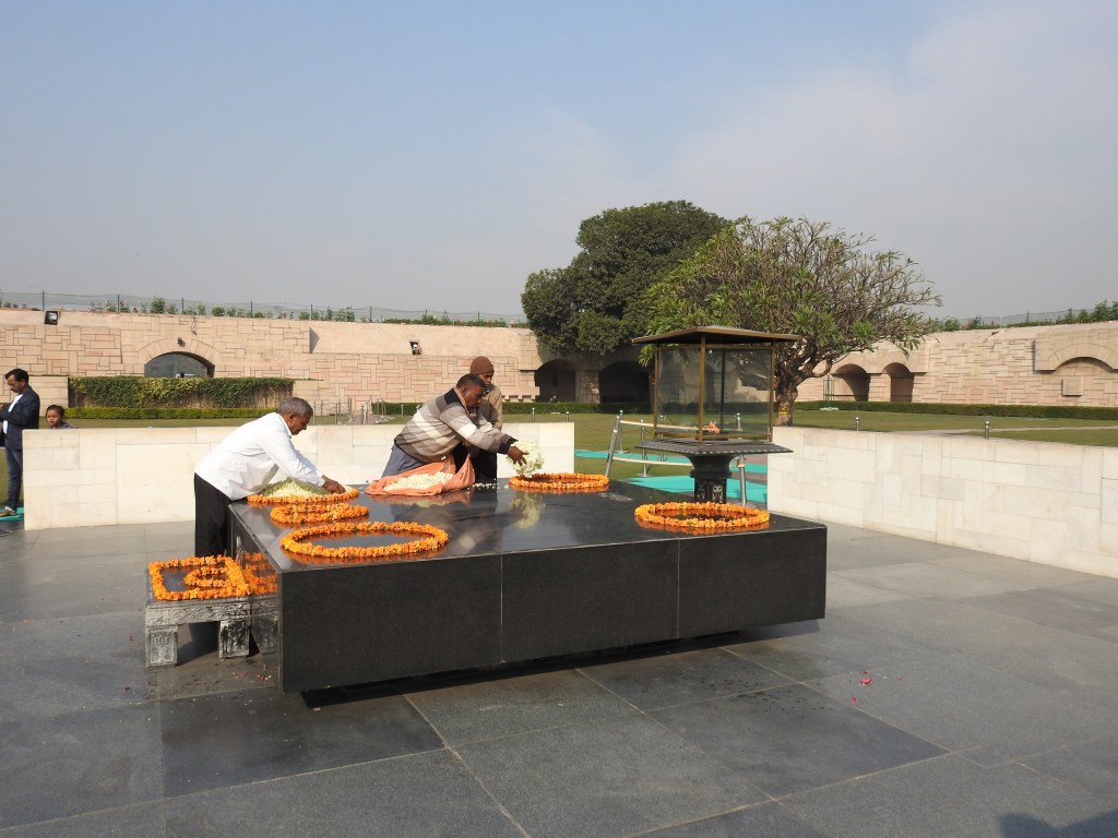Monday 13th  after our first Indian Breakfast – we stuck to chapati and fruit which we could peel – we were met by Bagu and Jay. Our morning consisted of a tour of the sights of Old & New Delhi. We visited the Raj Ghat- an open air memorial to Mahatma Gandi.