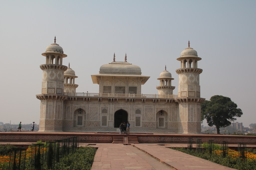 Jay then drove us South for approximately 4 hours. The traffic was manic and fascinating, tri-shaws, tuk-tuks, elephants, lorries, motor bikes and numerous more modes of transport raced around on the over-crowded roads….we stopped for a snack lunch at a service station once out of the bustle of Delhi. We were of course heading for Agra in preparation for our ‘Valentine’s extravaganza’!! Before arriving, we stopped to visit the Itmad Ud Daula, often known as the ‘Baby Taj’. This was built between 1622 and 1628 and is the tomb of Mirza Ghiyas  Beg and his wife Asmet Beghum. His son Nur–Jehan, who ruled the Mugal Empire between 1611 and 1627, built it to honour his Father. It is often described as a ‘giant jewel box’ because it is the first building to be built finished in white marble and is studied with Semi-Precious stones. It was one of the few quiet places we came across during our tour. Pretty gardens with Rhesus Macaque Monkeys enjoying themselves on the lawns, a truly regal and enchanting place.
