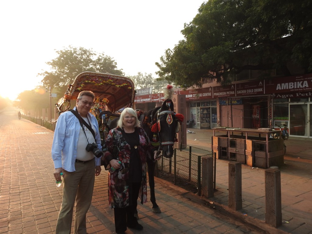 February 14th – Valentines Day. We were picked up early for our visit to the magnificent Taj Mahal, notably one of the finest pieces of architecture in the world, an exquisite monument to eternal love. The marble façade was in the process of being cleaned, so some scaffolding can be seen. It had suffered from years of air pollution and exhaust fumes causing its magnificence to become discoloured. Thankfully once cleaned this should not reoccurrence to the ban on motors in its vicinity. We took a horse drawn cart/carriage up to the entrance.