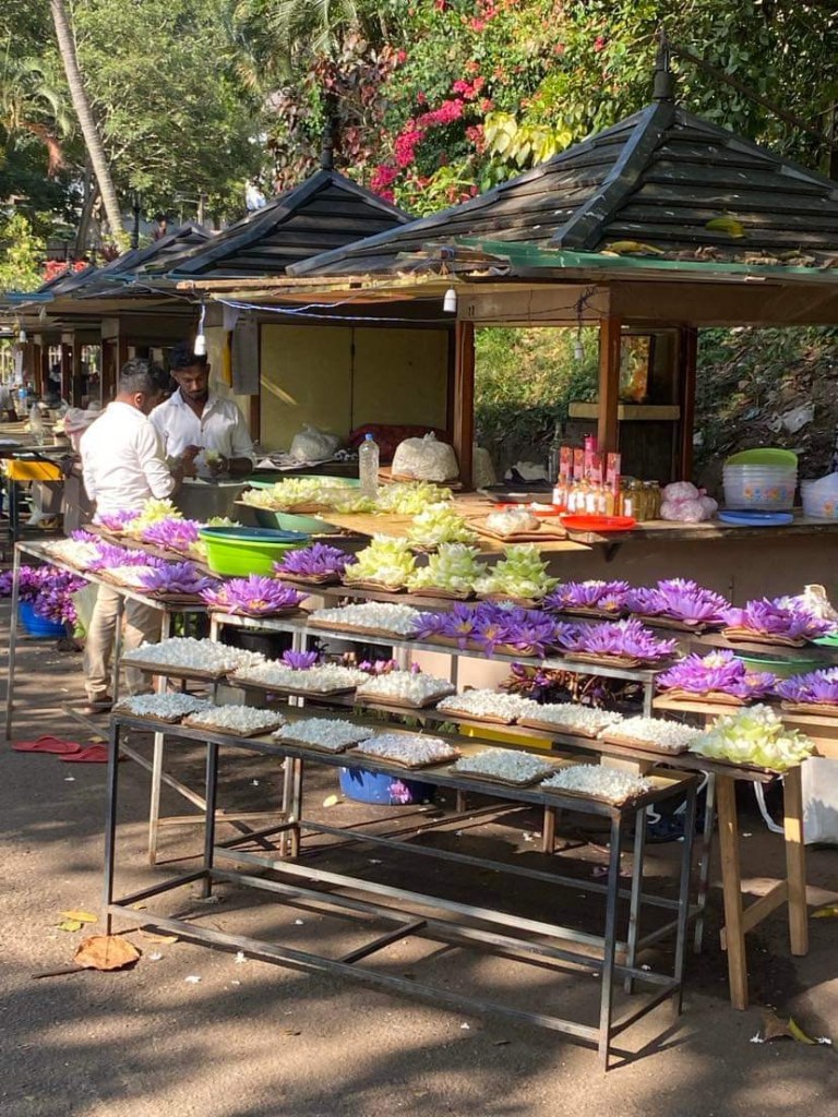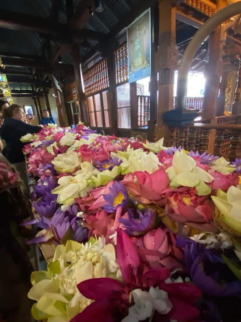 At 3pm Suminda collect us and we drove through Kandy to The Temple of the Sacred Tooth Relic. The temple is built near the ancient royal palace. The left canine tooth of Buddha is enshrined here and it is this that draws thousand of local and foreign devotees and tourists. A lot of flower sellers outside of the Temple do a roaring trade as locals make gifts of flowers to Buddha. This artefact serves as a significant symbol of Sinhalese identity and pride. Annually in August during the Esia Perahera procession the relic casket is paraded through the streets atop a male elephant. The 10 day festival is one of the largest Buddhist festivals in the world. The rest of the time the relic casket can not be viewed, it is kept in a chamber hidden securely behind closed doors.