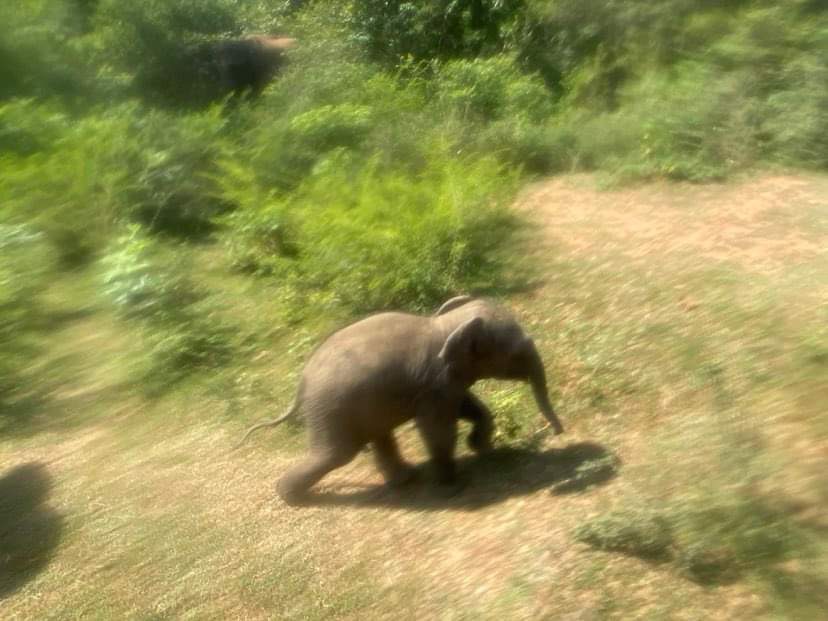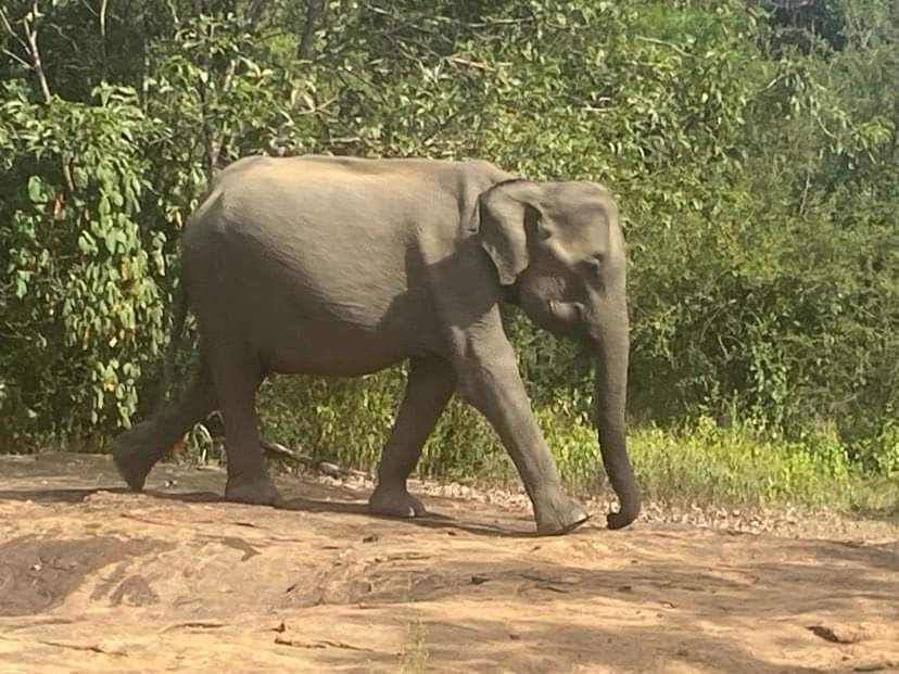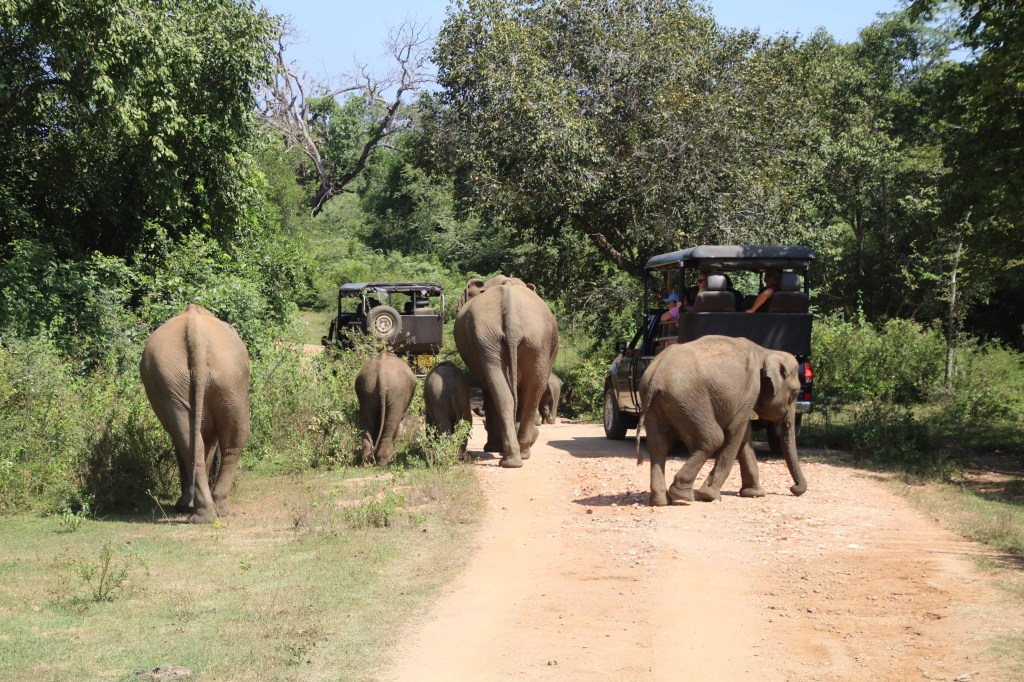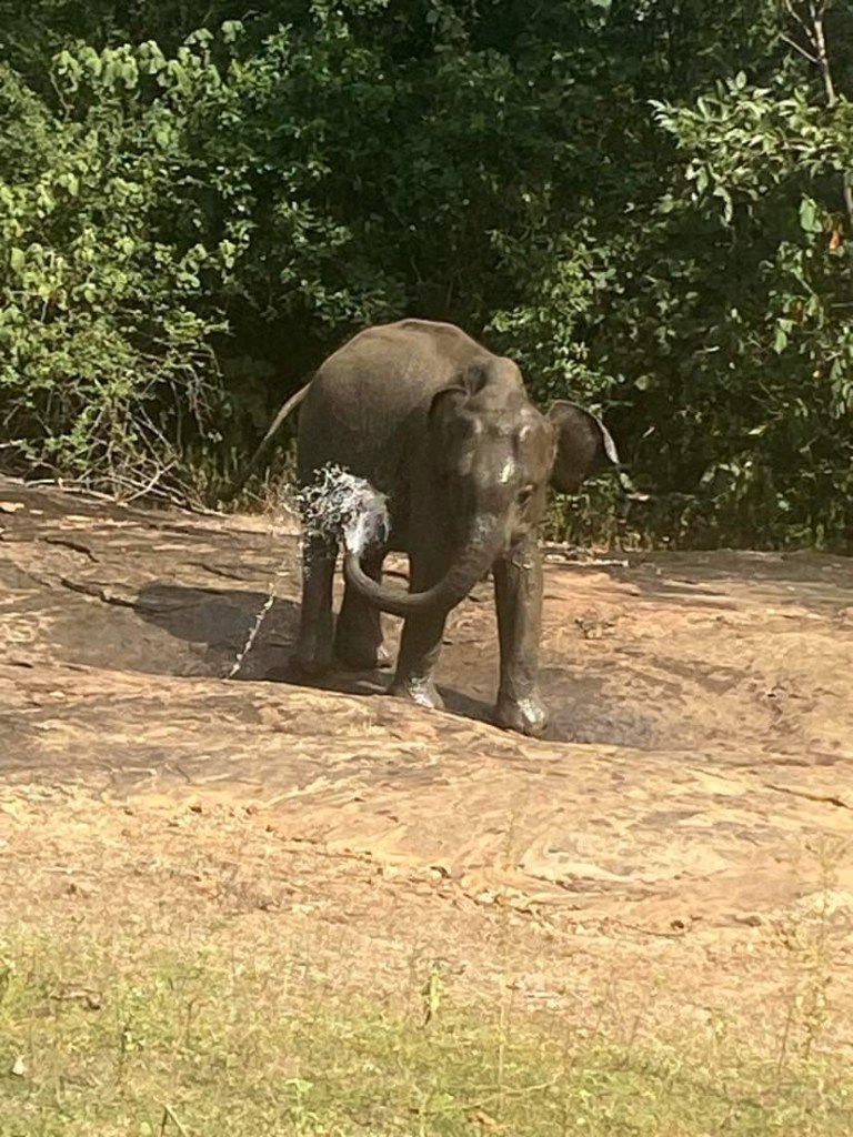 We hadn’t realised that Udawalawa was about an hour and three quarters away from our hotel, otherwise we would have changed hotels…..We awoke with stiff tired bodies, collected our takeaway breakfasts from the cook, who now greeted us with a smile ( proof that when you beam at someone constantly, they have to smile back…it had been a struggle but we got there!!!). Suminda drove us in the air-conditioned car and we enjoyed the, now usual, rural scenes along the way…….dogs lying asleep in the road, cows causing a road block, bicycles wobbling along, mopeds swerving all over the place, buses driving up your tail and peeping loudly as they push you off the road, school children in their white uniforms walking to the days lessons, teachers in saris greeting them at the gates of schools, roadside vendors selling an array of fruit/veg/buffalo curds. etc and so the daily life of Sri Lanka passes by our windows.