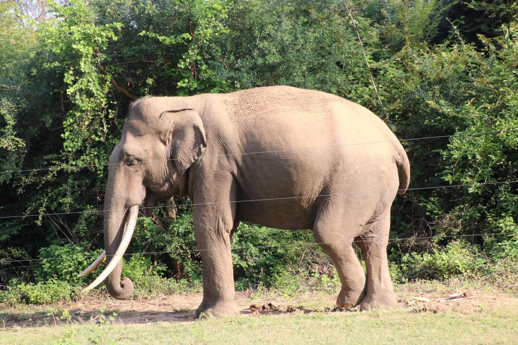 Just before the National park we saw a big tusker behind the electric fence. He was evidently re-known for standing there opposite a sweetcorn vender because people buy the corn and throw it over the fence to him. The Government warns against this as it makes the elephants dependant on this food and when they don’t get it they can turn aggressive, like the fruit searching bull elephant in Yala.