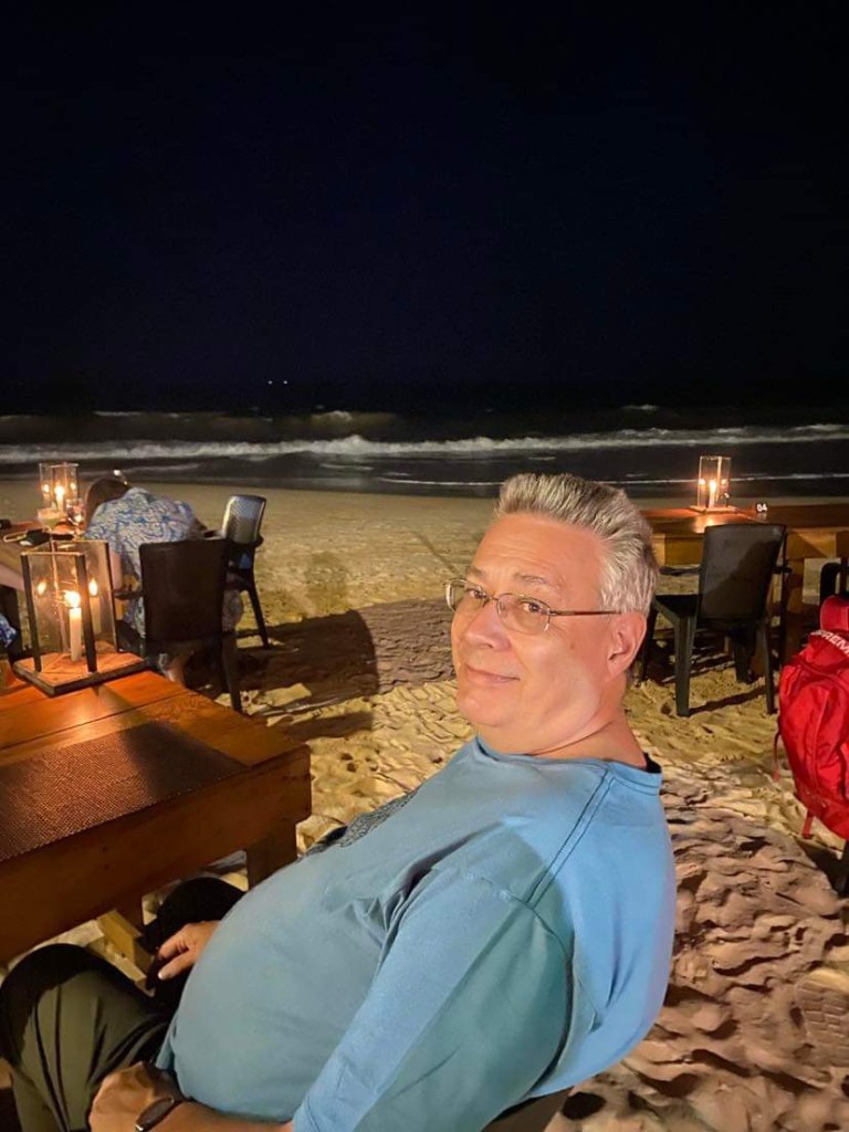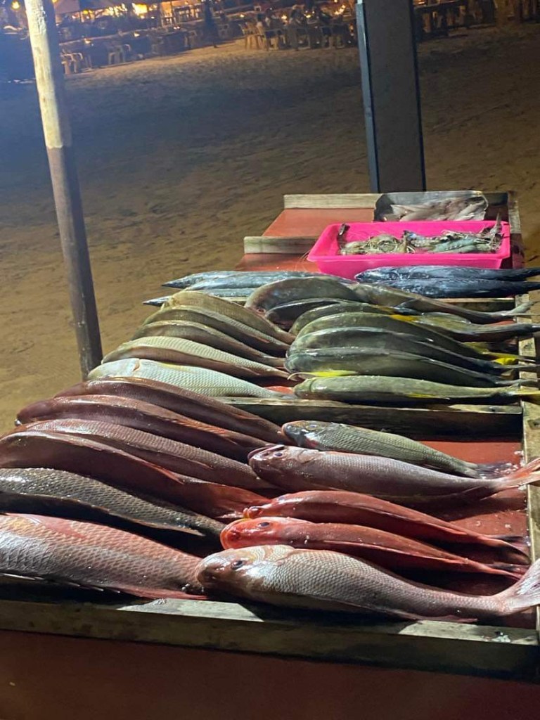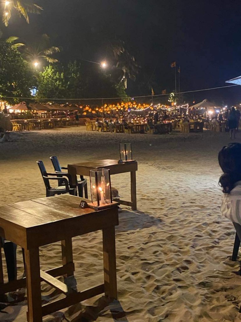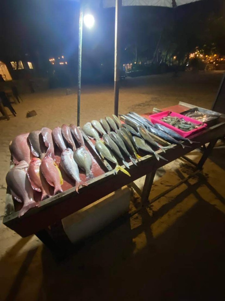 We got ready for supper and went downstairs. The food in the restaurant is supposed to be very good according to the reviews…..alas foiled again….the cook is off sick, so they’re not serving any food……….this is really turning out to be an episode from ‘Fawlty Towers’ !!! ….We will not be defeated !!! …so we hailed a tuk-tuk and went about a kilometre along the main road into town to a beach restaurant called ‘Salt’ although the sign looked more like ‘Solt’ …we were shown to a table just up from the waters edge on the sand…such a lovely spot…the whole beach was littered with different restaurants and tables and lights. Having been given our seats we were then taken to a table covered in fish. Our waiter suggested a large fish which he said was endemic to Sri Lanka…it looked like a white Mullet, obviously locally caught. We had it filleted and grilled and served with a few potato wedges and salad…it was divine…a really great experience.