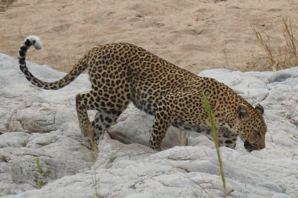 Leopards are creatures of habit and can often be seen in dry river beds silently approaching their prey whilst they are drinking in the limited pockets of water.