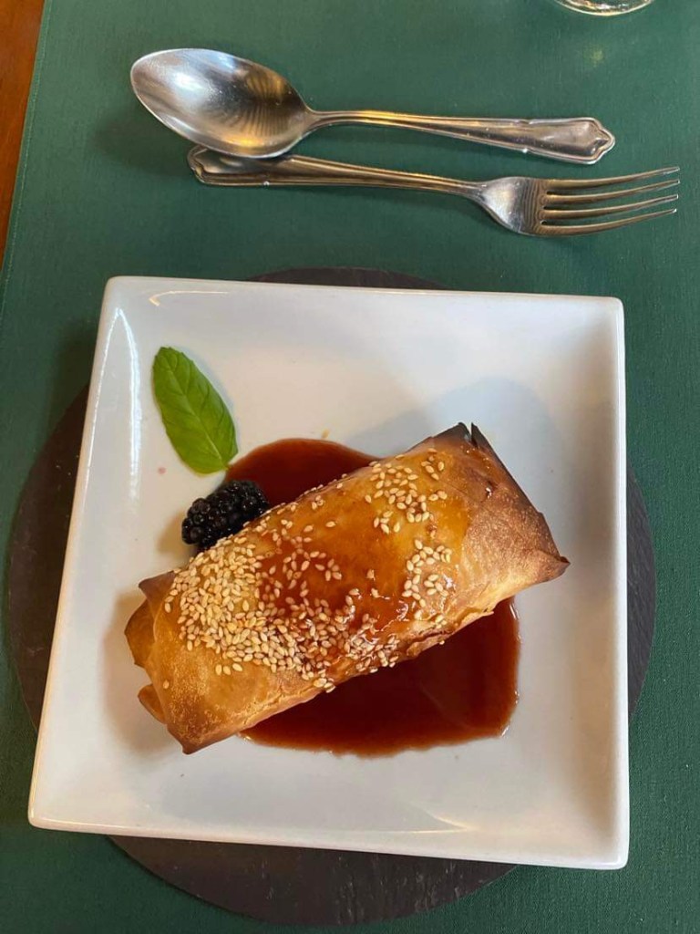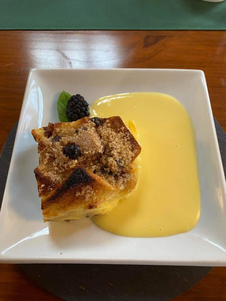 For dessert John and I both choose a sort of large spring roll stuffed with apple at each end and goats cheese in the middle….it was so yummy. Dad had a very tasty Bread and Butter pudding with custard……