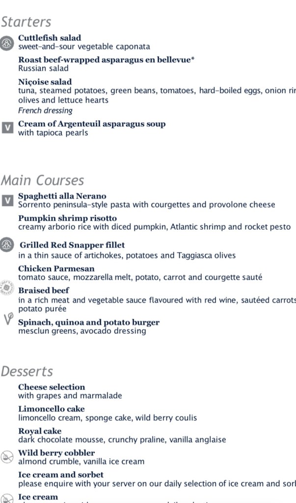 The day passed in a bit of a haze… packing done … envelopes for our cabin steward and both our dear waiters and before you knew it, it was time for supper… tonight’s menu was probably the least interesting we’ve had all week … but it was fine…