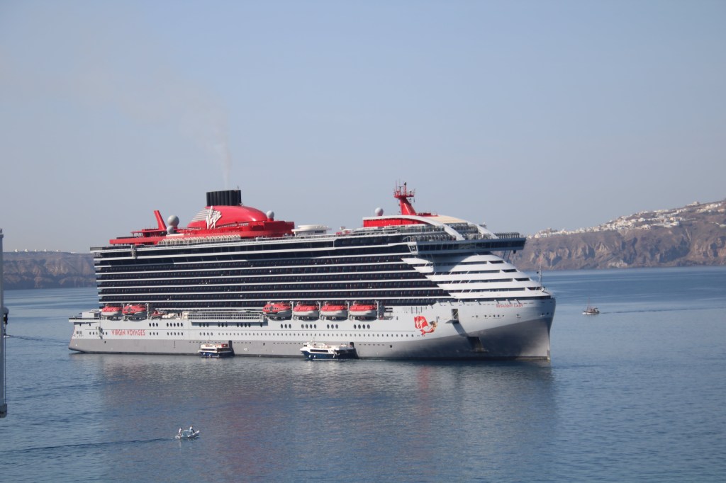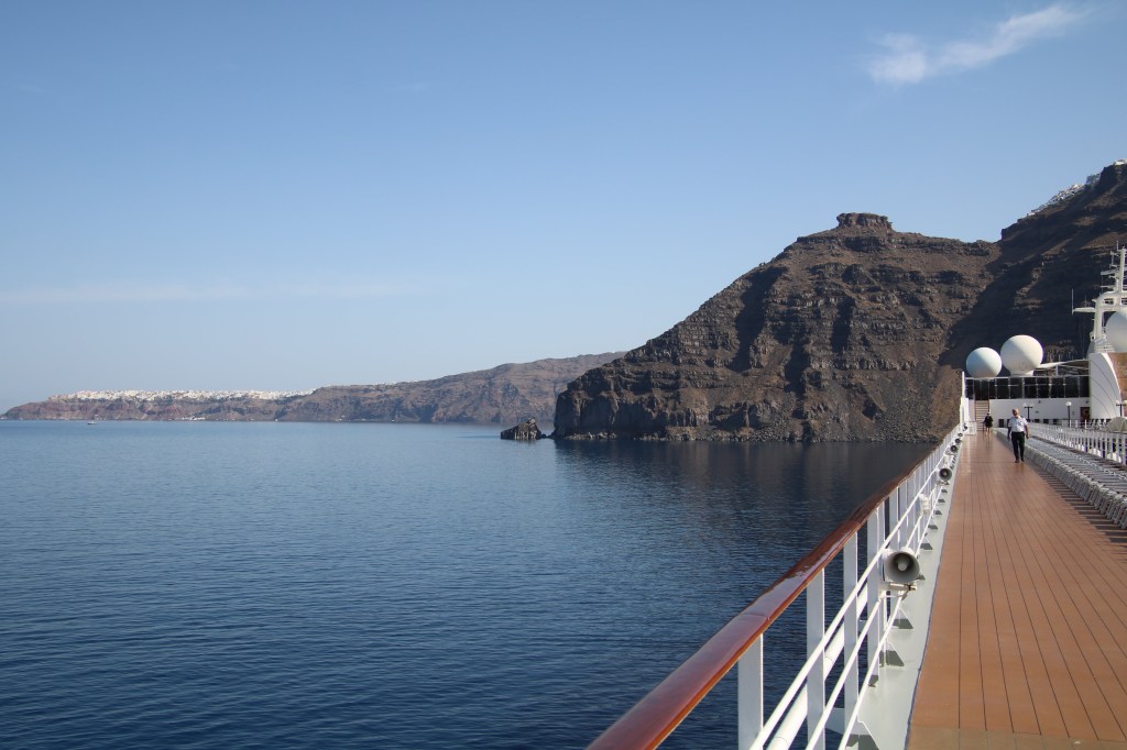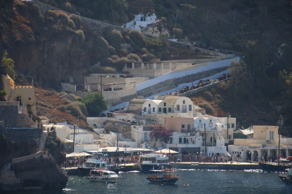 We had planned to go ashore today. It was a tender and Santorini is one of our favourite islands. However my cold got worse and I had a night of coughing it’s not the first time it’s happened whilst we’ve been cruising … I call it Kennel Cough … oppps I meant Cabin Cough… usually brought on by the Ships air conditioning.…. So today’s pictures are taken by John from the ship … we sat watching others tender and the going up and down on the funicular. It certainly looked a bustling small village.