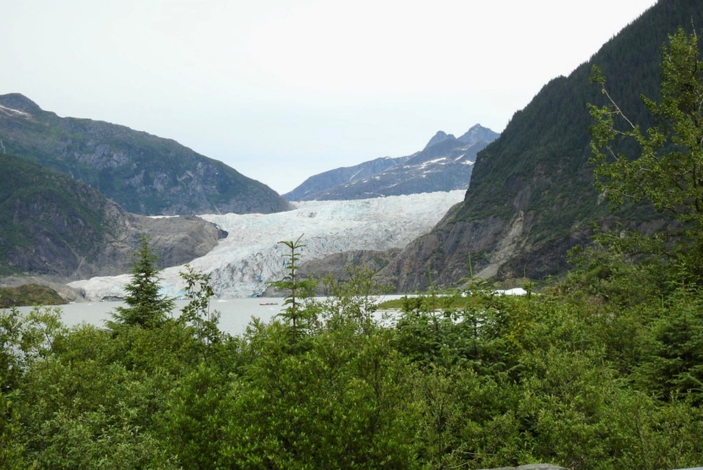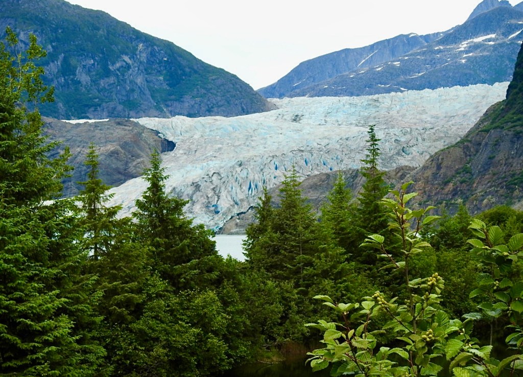 The beautiful Mendenhall Glacier is only 12 miles from the centre of Juneau and is a very popular attraction. Visitors enjoy a variety of activities here including hiking, wildlife viewing, and exploring the Mendenhall Glacier Visitor Center. On one occasion when we visited the UK BBC had just finished filming bears during the salmon spawning season from the raised wooden walkway along the river at the foot of the glacier. Lots of people choose to glacier walk here. We, however, like walking the wooden platforms looking for bears. We’ve been lucky a couple of times and even luckier to see a porcupine rattle past us.