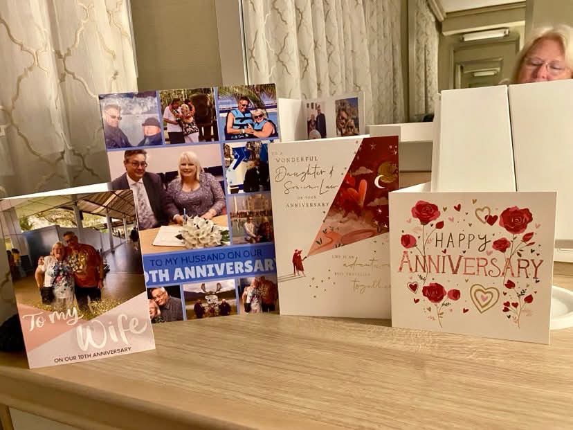 21st November 2024….a very special day….it’s our 10th Wedding Anniversary. We had a lovely day which started with us giving each other a card and gift… John gave me a gorgeous diamond eternity ring which fits perfectly below my two other rings. I gave him an engraved tin containing cuff links with J&J on … So I went for the traditional 10th anniversary gift-tin and John went for the modern-diamond.