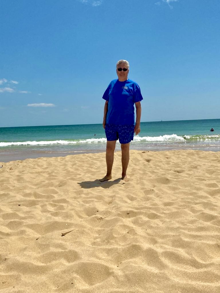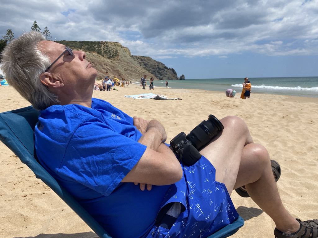 We were a little late getting up…or should I say I was !!!! Our first apartment breakfast was served by John! He had fruit salad and I had toast and marmite both followed by cherry yogurt and coffee which we bring from home….We packed a beach bag and headed for the car. I had researched that a place called Sports Zone had beach chairs at a sensible price…I had also memorised the route…straight up the road in the direction of Lagos over two roundabouts and right at the next….hey presto we were there….i was dead chuffed with myself. Into Sports Zone I stride full of confident anticipation….bad news only the big stores in Lisbon and Faro stock them. I will not be foiled !!!! Sports Zone is next to a supermarket called Continente. We wandered all around but no chairs so I asked an elderly shop assistant who found a young lady to help us…she said to wait, so we did. 10 minutes later she came back with a trolly and assorted deck chairs. Most were the very low type which leave you virtually sat on the sand, but ! She had one high one with a high back and built in pillow. It didn’t have any arms but Hey Ho beggars can’t be choosers. I sat on it and it with held the weight so we asked if she had 2…..off she went again and came back with a matching pair of teal green ones…they were €20 each…bargain SOLD…YEAH!!!