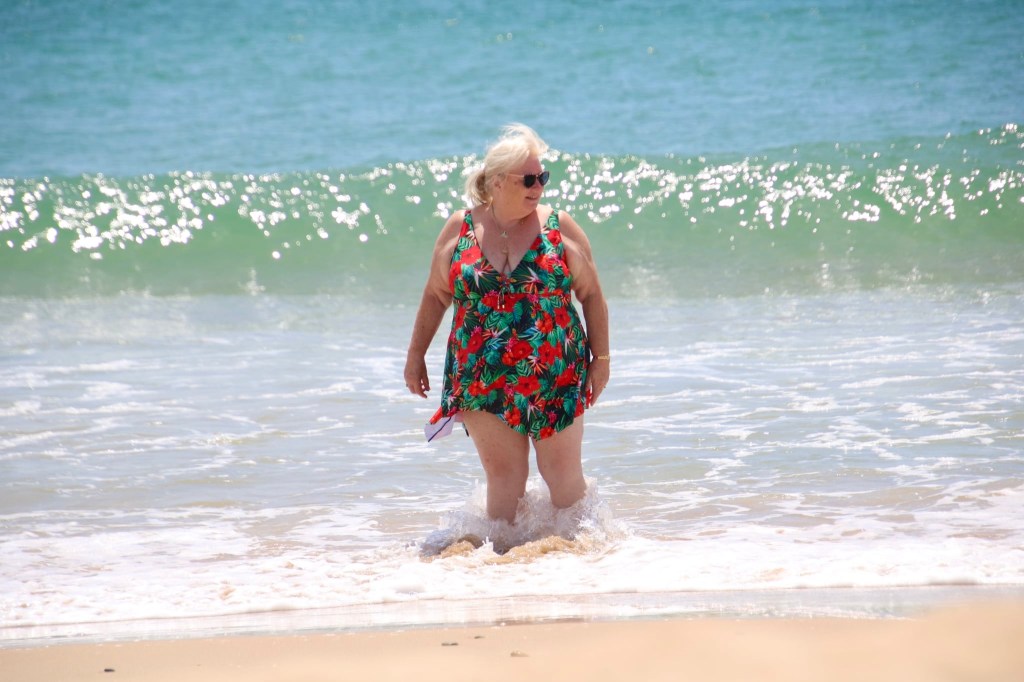 It was as easy to get back to our apartment as it was going, in fact it took about 8 minutes. We off loaded our groceries and changed into swim suits. I quickly made a picnic and we were ready to go again. Back in the car and down to the beach…..oh no…. It was the first time the parking was all full….we said we’d give it 10 minutes, and sure enough after 7 minutes a couple wandered back to their large UK plates Audi and off they went and in we pulled….yipeee.. A 1 minute walk had us setting up camp on the beach. Chairs out and what a pleasurable lunch we had. After lunch I walked down to the sea and paddled along. It was a tad cold but not too bad. Joh said he was people watching, but I caught him having a snooze !!! . Later he also had a quick paddle. It was a wonderful way to spend the afternoon.