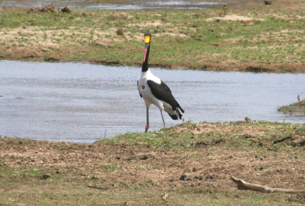 We stopped at the edge of the water for elevenses. We are now reduced to park purchased processed cheese on some Woolworths crackers..not too bad. We watched three waterbuck walk along in front of us…they had a youngster with them. We saw a saddle-billed stork waddle along. An enjoyable half hour break from driving.