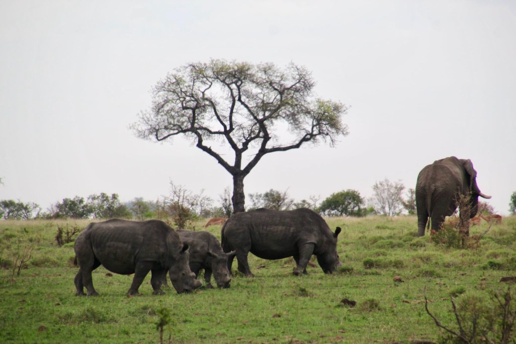 We continued along the road and lo and behold we saw two adults rhino and a young one and a short distance further on two more. We sat for ages watching them. There was a huge elephant behind the family of three…he looked like their security guard!