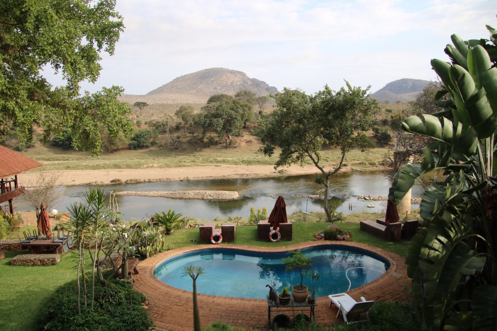 On arriving in Malalane we have often stay outside the Kruger National Park and go in daily. We’ve stayed at Prestana Kruger Lodge… a lovely setting on The Crocodile River. It is just 700 metres from the gate into Kruger. The hotel and lodges are set in 22 hectares of unspoilt scrub land…. It has a lovely deck and restaurant and the deluxe rooms over look the river. It costs about £100 for a double room bed and breakfast for two.