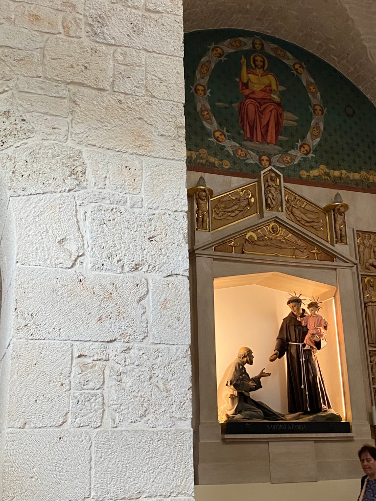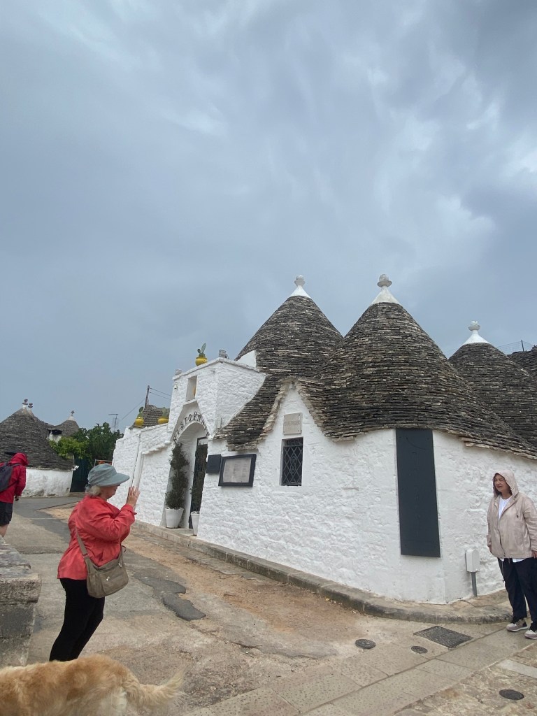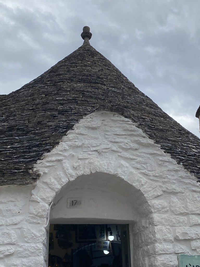 …or into the street and down into the river at the bottom of the hill. Today’s main road is where the river used to be and that’s where all the houses got their water from unless they had their own well. The roofs, like the buildings, are self supporting, held together in their conical shape by the forces of nature.. equal pressure on all sides. The roofs were embellished with decorative pinnacles representing the signature of the architect. Over the front door is an extended slab. If this is pulled out the front section of the roof collapses. It was designed like this so that in olden times when the inspectors came to tax the houses the owner would quickly pull out the slab so that the inspectors saw a lot of rumble and an unfinished house so no tax was levied. Our guide laughed and said Italians have been dodging paying taxes ever since!!!!