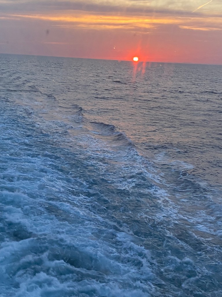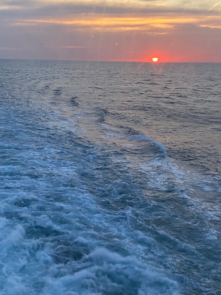 Another pleasant menu. The ship was still docked when we sat down and there was some lovely street art/ murals. Part way through our meal we started to sail away and we were treated to a rather nice sunset, across the wake of the ship ( surprising as we’ve hardly seen the sun today). A lovely sight.
