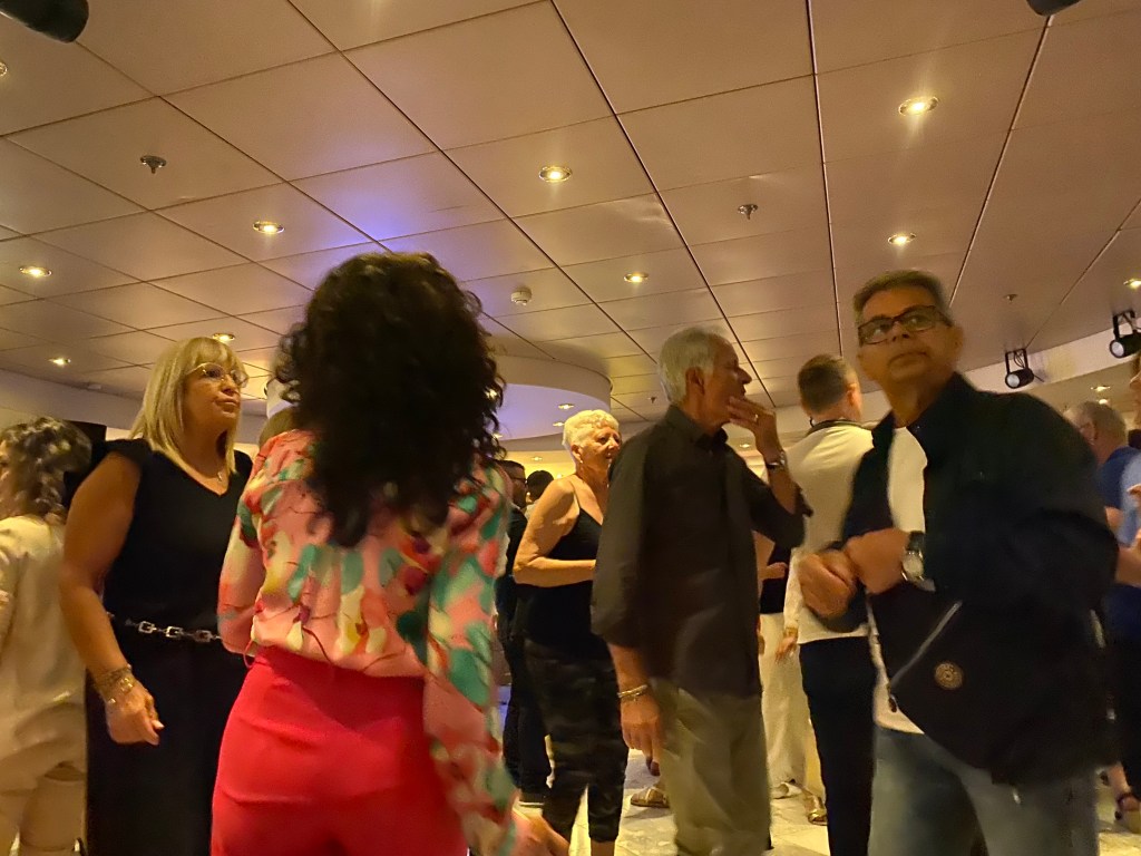 After our meal we headed to our usually quiet bar only to find it heaving with people. There was some ABBA music playing and everyone was dancing … we think it’s a school holiday in Italy because our new cruisers have a massive amount of children with them….. I know I am old school but I really dislike seeing babies being shaken about in the arms of their hip-hop dancing parents… it can’t do the babies brains any good and children dancing on the dance floor when adults are trying not to squash them at 10.45 pm is not good… it’s adult time….Like I said I am old school….