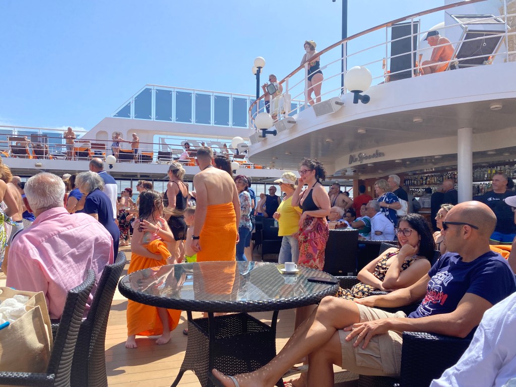 After breakfast we went to guest services to see about having our double charged Corfu excursion refunded to our credit card…. No! They can’t do that … the day before we disembark we can go to a machine and it will refund us in Euros….. we questioned this because it was their mistake not ours but we will end up paying twice for a non sterling transaction and we have to accept what ever exchange rate they give us in Euros…. Ummmmm not very happy that we have to pay for their mistake……. we went to go up on deck… however we were told we couldn’t use the lift because those that failed to turn up for the official Muster drill on Embarkation were doing it in the Theatre… so all lifts were out of use for at least 30 minutes…. John had a few words to say about that especially as due to my knee walking up the stairs in a non emergency situation was not good…. Just as John had finished his reasoned response the lift doors opened and people poured out… at which point the lady said we could use it as it was a ridiculous situation… something MSC should sort out… punishing people who have done the right thing seemed ludicrous… Anyway finally on deck and every sunlounger, on both levels, had a towel or a person on it … not an empty one in sight.. there were no staff preventing the reservation of loungers by towels even though the person probably wouldn’t be using it for hours…. shame !!!