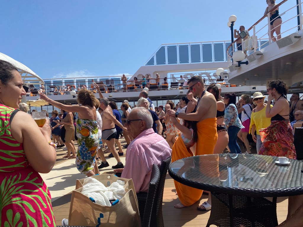 We finally found a table with 2 chairs in the direct sun on the edge of the heaving dance floor…. It was only 10.15am….. more and more people poured onto the floor…