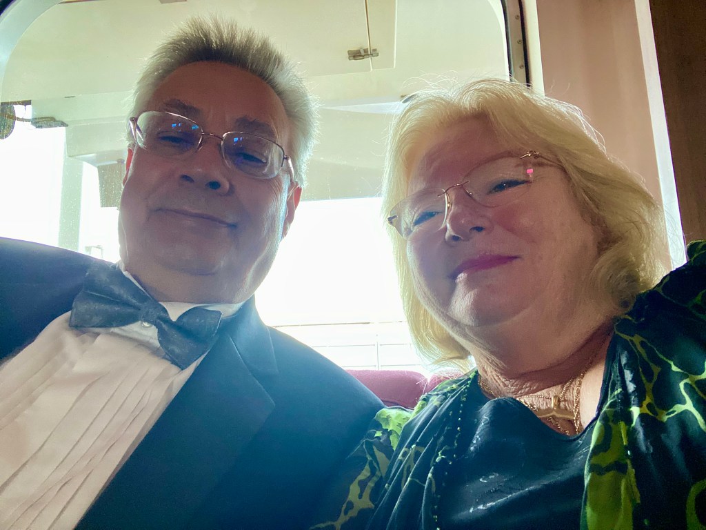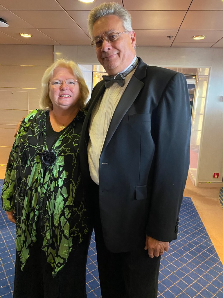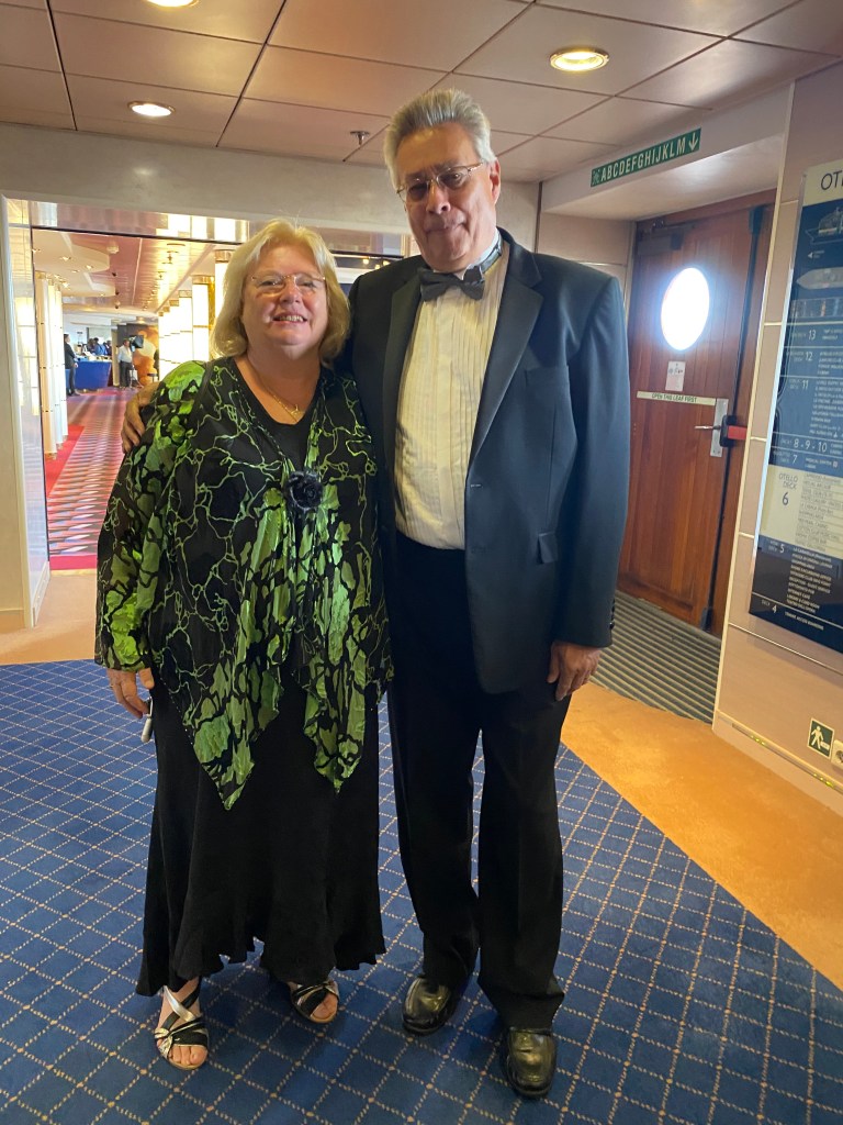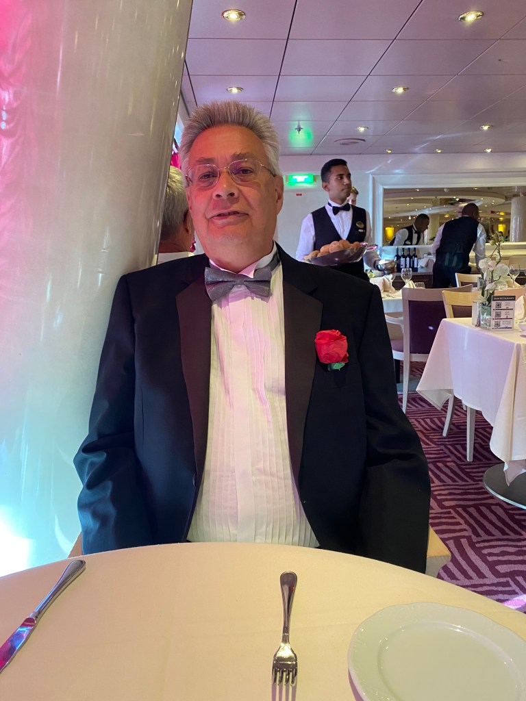 . We sat for about 45 minutes before trying to find a shaded table but the only ones were on the smokers area which was thick with smoke so we gave it a miss and retreated back down stairs to our quiet bar for a game of Canasta… After which we decided to have a before lunch siesta!!! There was a bottle of Prosecco in an ice bucket, a plate of macaroons and two bars of dark chocolate in our room….. we are diamond loyalty and this is what they give you on Dress to Impress night….. Well! The before lunch siesta turned into an all day one….. my body must have been more shaken up than I thought and John, bless him, just looked after me by letting me sleep. I naturally woke up just before 5pm and felt quite a bit better… I showered and did my face and hair ready for tonight’s black tie event…. I wonder if John will be the only one in a Dinner Jacket!!! We will have to wait and see.