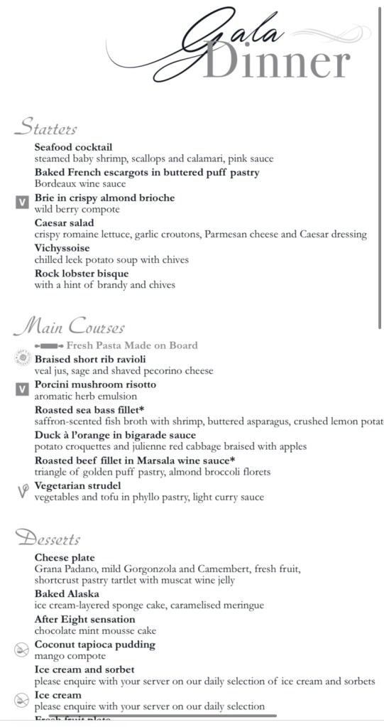 The day passed in a bit of a haze… packing done … envelopes for our cabin steward and both our dear waiters and before you knew it, it was time for supper… tonight’s menu was probably the least interesting we’ve had all week … but it was fine…