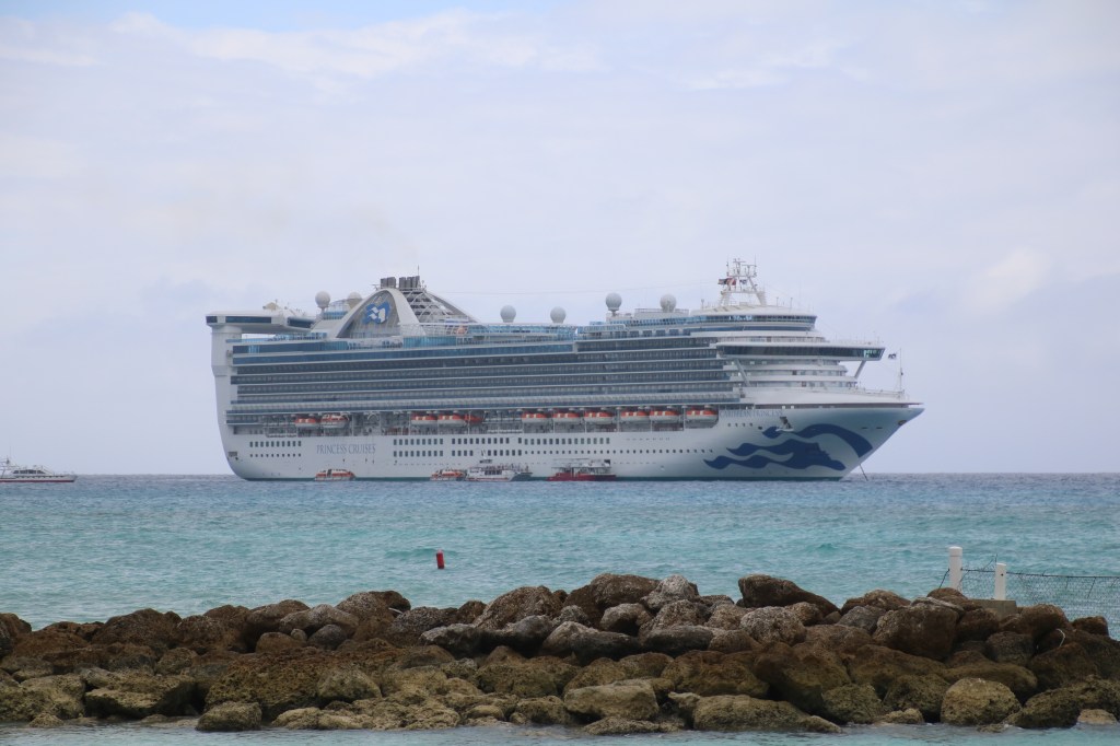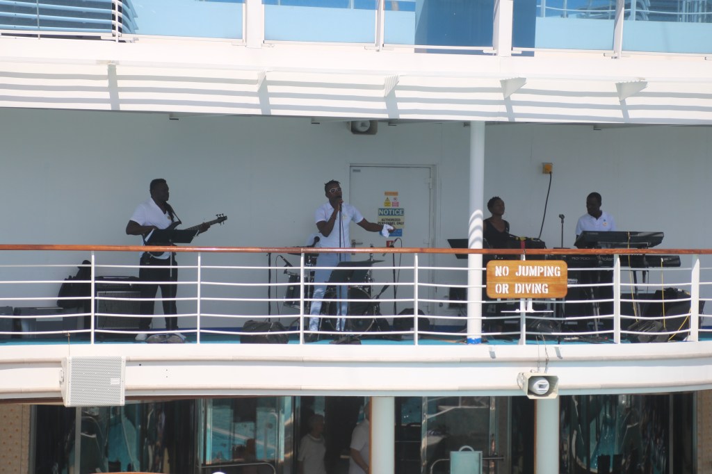 What’s more, the island has constructed, with a little help from the EU, a tramway linking the two towns. The infrastructure appears to be in place, but that tramway is still not open for business. It’s promised ‘any day now’. We also learn that last night’s theatre entertainment, a comedic magician from Queensland, is one of our fellow trippers. There’s a lovely warm breeze as Caribbean Princess sails away from its pier around 1700 and further south in the Lesser Antilles. Just a slight delay in getting a table for dinner tonight. After that, Tommy McPhee’s on good form in Crooners.