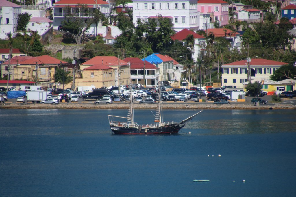 Tuesday, 16th January 2018 – Charlotte Amalie, St. Thomas, USVI. It’s 1030 as we get our first glimpse of the Virgin Islands. Carnival Magic seems to be racing us to port. It’s a race that we were destined to win as the Carnival cruise ship docks behind us a few minutes later. We’re at West Indies Company pier (WICO) next to Havensight shopping mall about 1 and ½ miles from downtown Charlotte Amalie. Some missing roofs and a boat or two, now abandoned, that were washed ashore – the evidence of the recent hurricane damage. Other than that, this little capital is very much open for business. Three cruise ships in today – a Royal Caribbean as well as the 2 of us in WICO. Most of the shops are open as we approach the centre of town on our safari bus style taxi from the ship. ($4 per person each way). We stop for a coke at the Side Street pub – offering free wifi and we eventually skype to the UK. Our browsing in and out of the shops and market stalls is interrupted by a couple of short but heavy showers – typical Caribbean. Within minutes its scorching sunshine again and approaching 80 degrees.