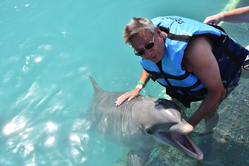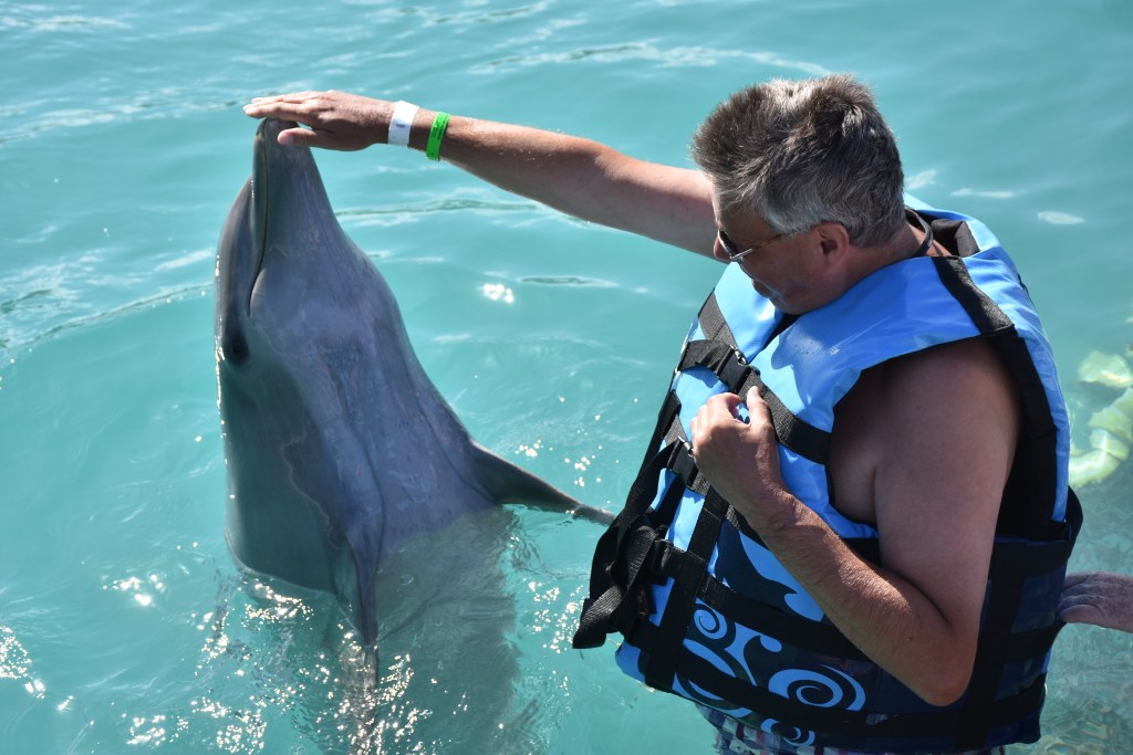 Our next trip to the Caymen Islands we decided to revisit the Turtle Centre and this time we went across the road to the Dolphin Sanctuary. All the dolphins have been rescued and due to their medical needs they are very used to human interaction. To fund their keep and further rescues they run Dolphin Experiences…. We were given life jackets and had been told to wear swimming costumes and swim shoes. We stood up to our chests on a ledge in a very large area of water. There was a mother and calf and the mother came and greeted us all by shaking our hands, rising out of the water to a raised hand, kissing us and rubbing our cheeks. After our individual experience the mother returned to the other end of the area and proceeded to teach her calf how to leap and twist and turn out of the water…it was an amazing sight.