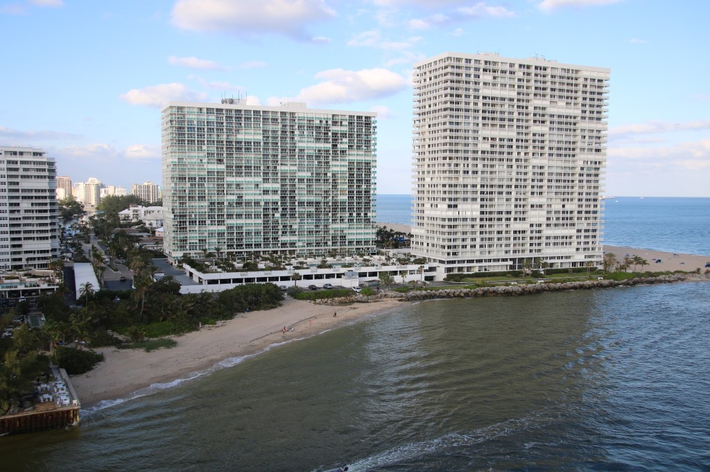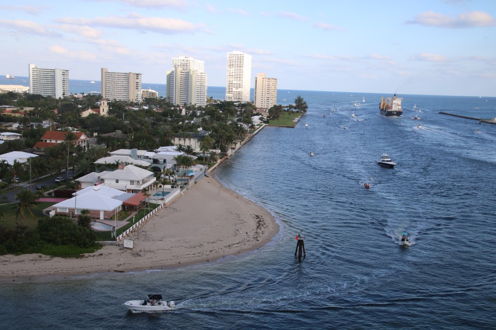 The hotel name lives up to its billing. We are right in the heart of the marina with some very expensive water craft moored alongside. The first of these is Cayman Island registered. A reminder of one of our stops in around three weeks’ time. We both enjoy the wide choice of breakfast from an unlimited buffet for the fixed price of around $22. By the time 1100 comes round our Princess lady has arrived and, although we’re not on her transfer list, we are soon on the short coach transfer to our ship. Impressively, this was one of the fastest and smoothest check-ins we’ve experienced and by 1300 we’ve dropped off our hand luggage in B (Baha) 417, our stateroom for the duration. Its around 70 degrees with a noticeable breeze and partially cloudy skies. We’re through the General Emergency Assembly by 1530 and shortly after 1600 we slip away from our mooring and head out to open waters. 4 other cruise ships are in today, including Nieuw Amsterdam, Costa Deliziosa and Harmony of the Seas.