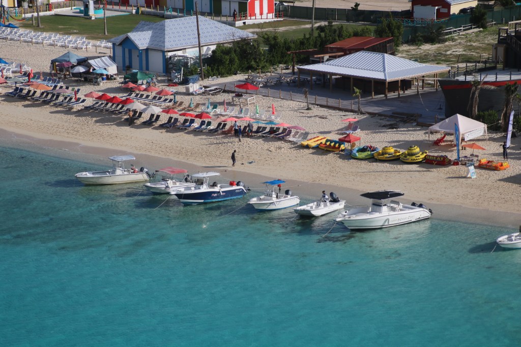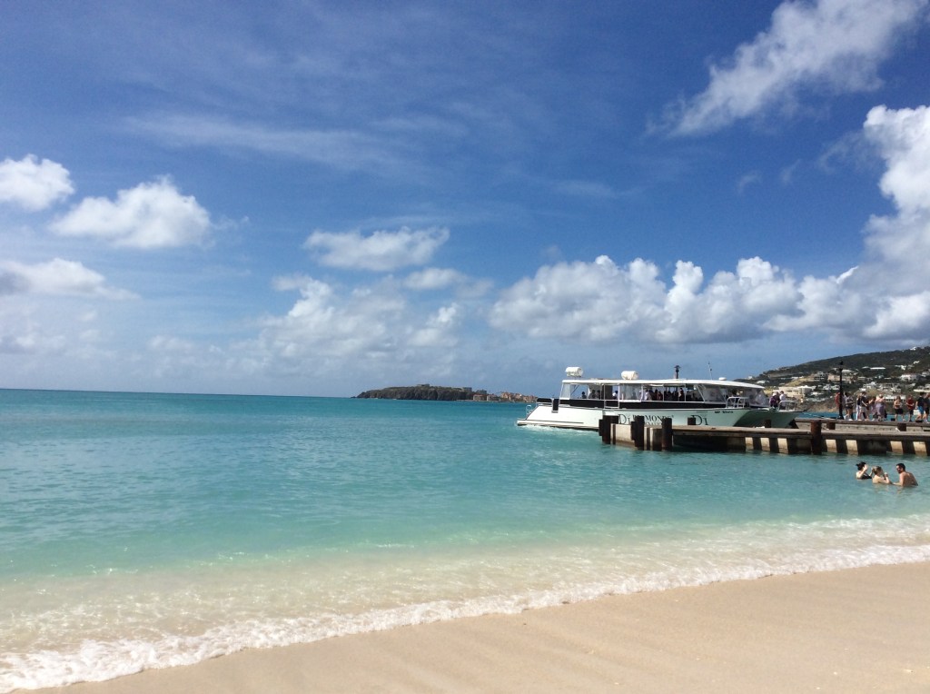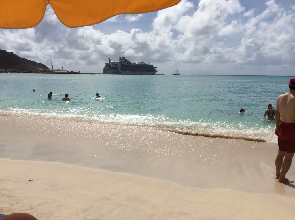 Back on board, the restaurant system seems to have changed. No queue for a table tonight and no sign of any beepers. But, we seem to wait for ages to be served and its an hour and a quarter later tonight that we attempt to get a seat in the theatre, at around 1945. A few seats still available and its worth the effort. Our piano entertainer, Craig Dahn, is out of the top drawer. It seems he was discovered by the late, great Liberace and proud of it. His act included tributes to Gershwin, Rossini and, more recently, Jerry Lee Lewis, Elton John and Adele. Tommy McPhee is wowing them in at Crooners as per usual so no chance of a seat tonight. We eventually abandon hope and head for a drink In the Club Fusion, where the Voice of the Ocean auditioning is taking place. Our vote went to number 1 for her version of ‘Crazy’. St. Thomas to St. Maarten – 107 nautical miles. Wednesday 17th January 2018 – Philipsburg, St Maarten. It’s the Dutch side of this divided island today. There’s a bit more evidence of the recent hurricane damage here, particularly along the Boardwalk. We decide to head for the beach on Great Bay taking advantage of the water taxi service at $7 each for the day. Add to this our hire of 2 loungers and a parasol, complete with cans of coke, at a further $25 all in. Quite an economic way of enjoying this island’s beach experience. It’s only when you get up close to the town’s buildings that you realise the repair work going on – or properties obviously waiting for the appropriate materials.