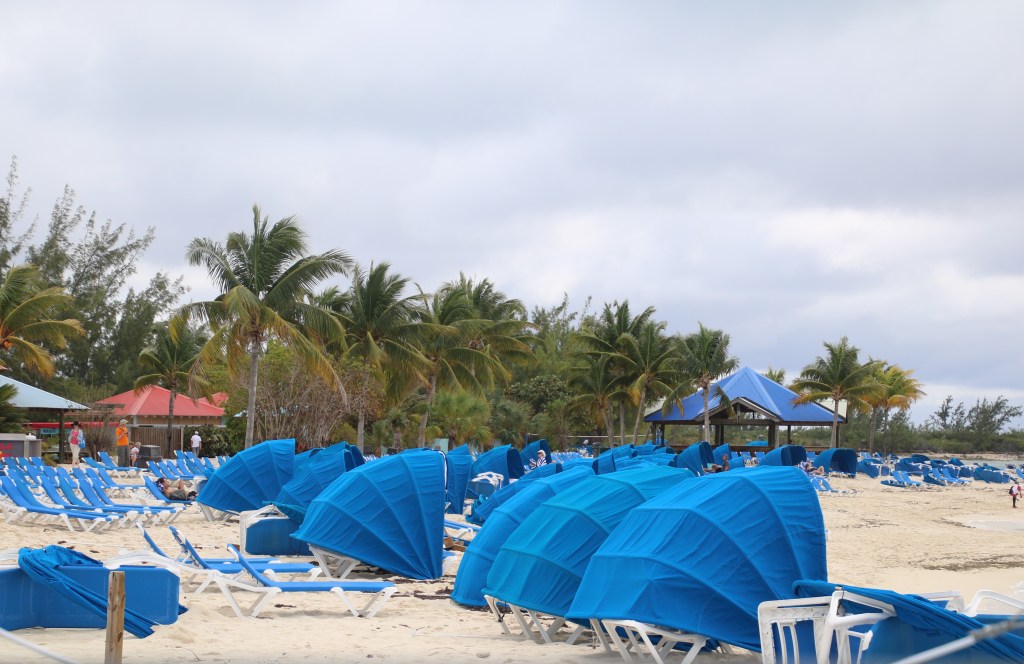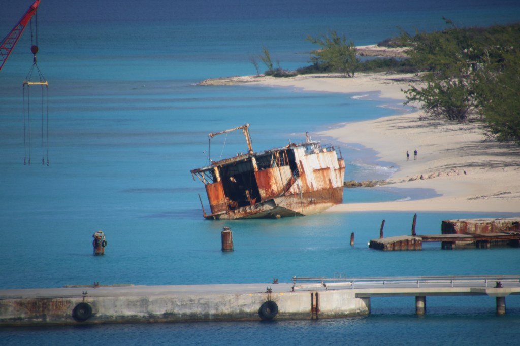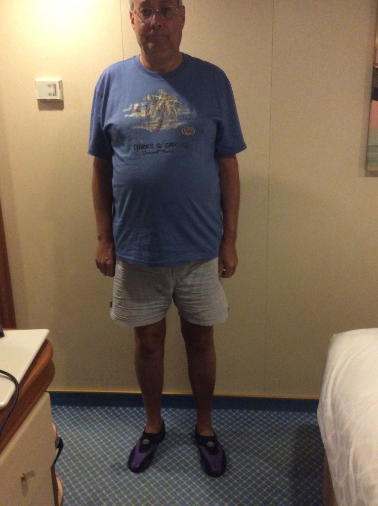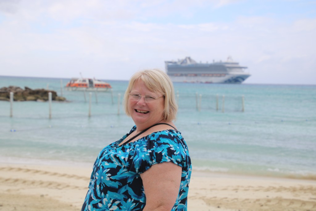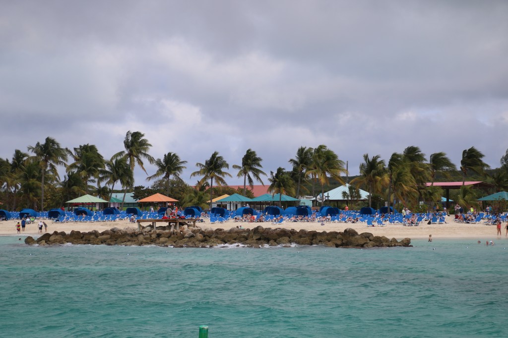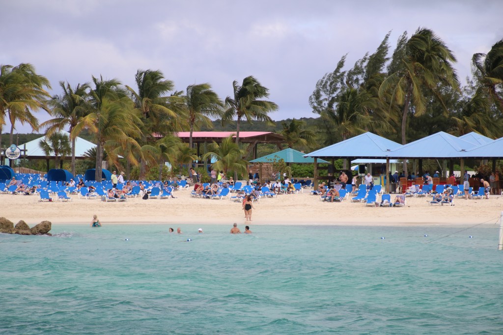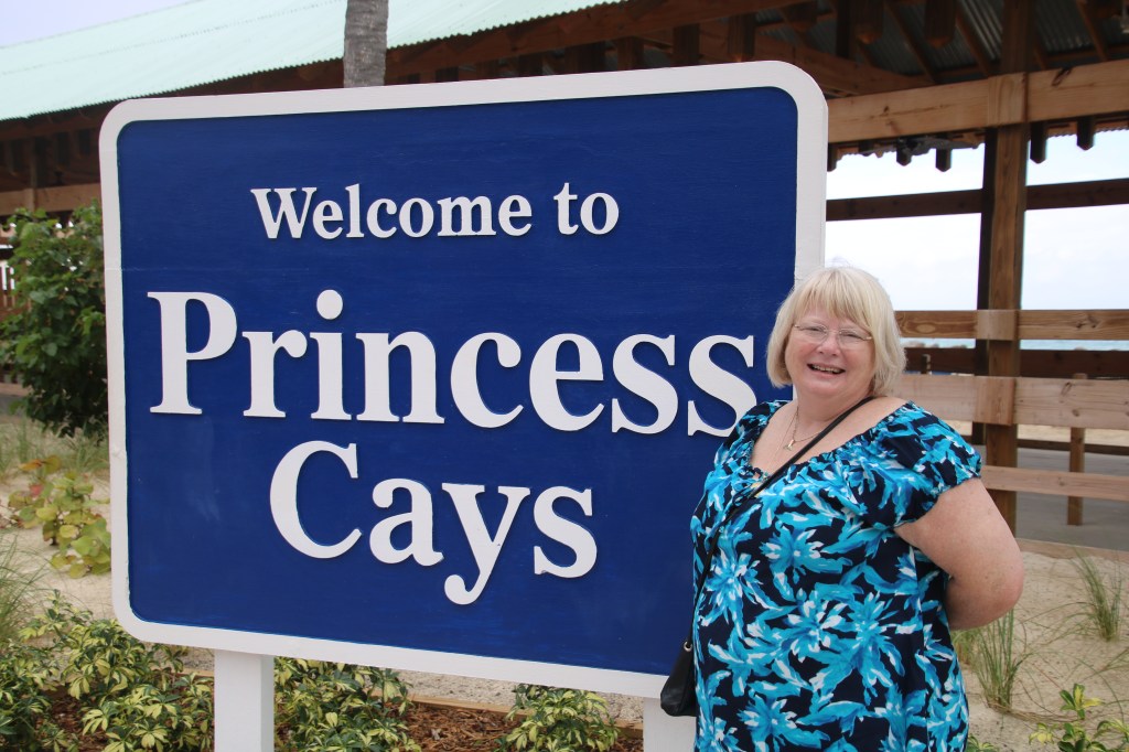By 1100 we are back on board having posed, once again, for our embarkation photos. A couple of hours followed where the sun breaking through altered the weather dramatically. An early lunch and a chance to ‘people watch’ as our next cruise passengers start to arrive. Seems a much higher percentage of US residents this cruise. Muster station assembly is at 1515 with ‘sailaway’ a little under an hour later at 1605. The weather remains dry for the on-board party as we head out into the Florida Straits. We’ve already established our dining arrangement in the Island Restaurant – 1830 for a table in Siti’s station area – and Igor, the assistant. And it works as we jump the substantial queue/line and are shown straight to our table. Will this be the end of ‘beepers’ for us? We shall see…. We meet up with 3 US cruisers for the ‘welcome aboard trivia’ quiz – and manage 16/20 to come 3rdish. We both contribute to the team answer sheet so leave with our pride intact. We should have known that the country with the longest shoreline is Canada not Australia. We’d forgotten that Princess Cruises was established in 1965 and that Columbus reached the Bahamas in 1492 not 1493. We were foxed by the fact that there have been 5 films in the Pirates of the Caribbean series. Never mind. We learn shortly afterwards that we are to turn back towards Florida to rendezvous with a helicopter despatched from shore to airlift a passenger requiring urgent medical treatment. This, combining with a strong, 45 mph wind to contend with, is going to delay our progress to the Bahamas Cays. We head off to Crooners after the quiz. Tommy McPhee has to contend with his ‘newbies’ tonight but he soon attracts an attentive audience. He deserves to. Port Everglades to Princess Cays – 279 nautical miles. Sunday, 28th January 2018 – Princess Cays, Eleuthera, Bahamas. We have had a rocking and rolling night. And any doubt that we’d be able to get in to Princess Cays is dispelled by our Captain. Shortly after 1000, he announces that last night’s medical evacuation together with the poor weather has delayed our arrival, but only until around 1130. Sure enough, at a little after 1140, the tendering process has commenced. Our turn to go ashore comes at 1310 and, just fifteen minutes later, we’re on the beach. Our newly acquired water shoes make it an easier choice as where to go in the sea – we chose to enter ‘our’ own space in this little paradise.