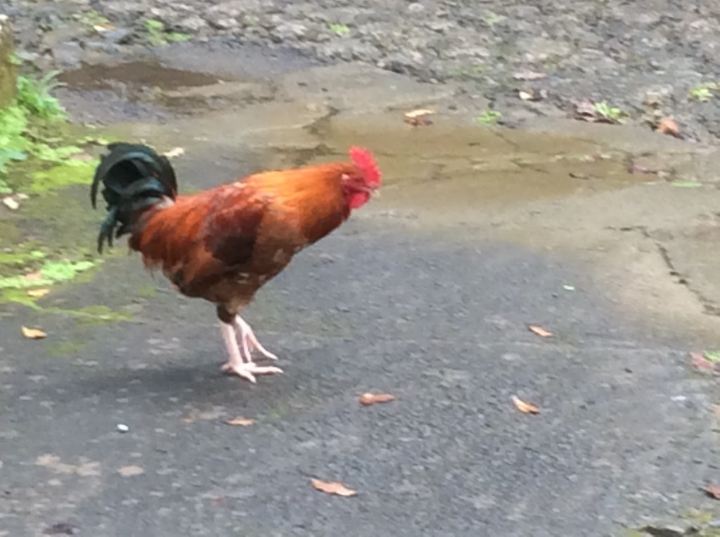 We stop at a river beauty spot before heading deeper into the rain forest itself. At the riverside, we witness an interesting stand off between a cockerel and a cat.