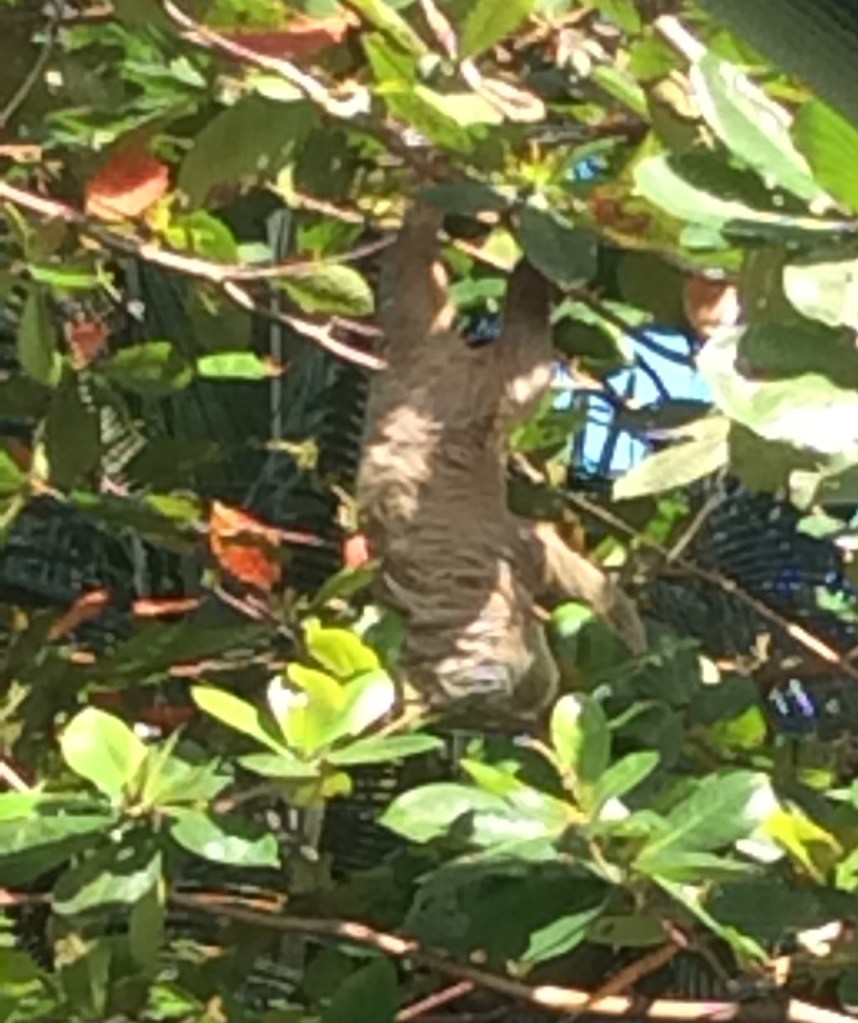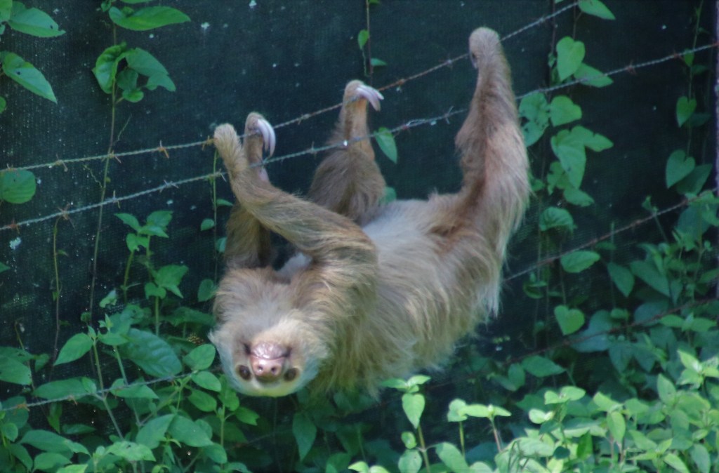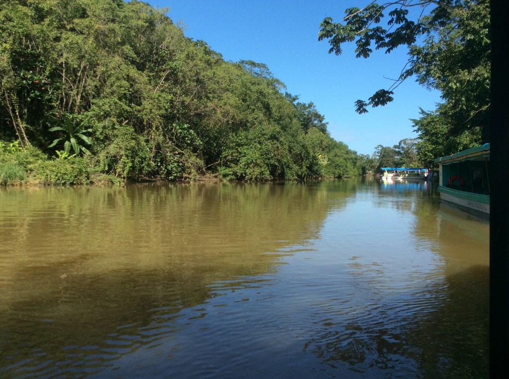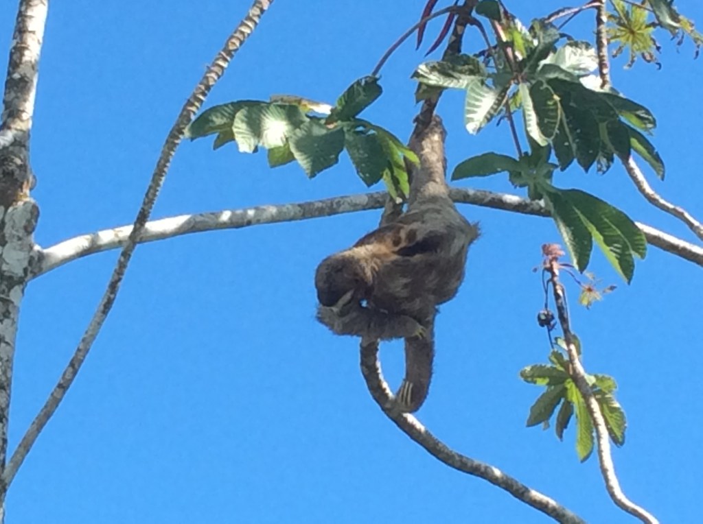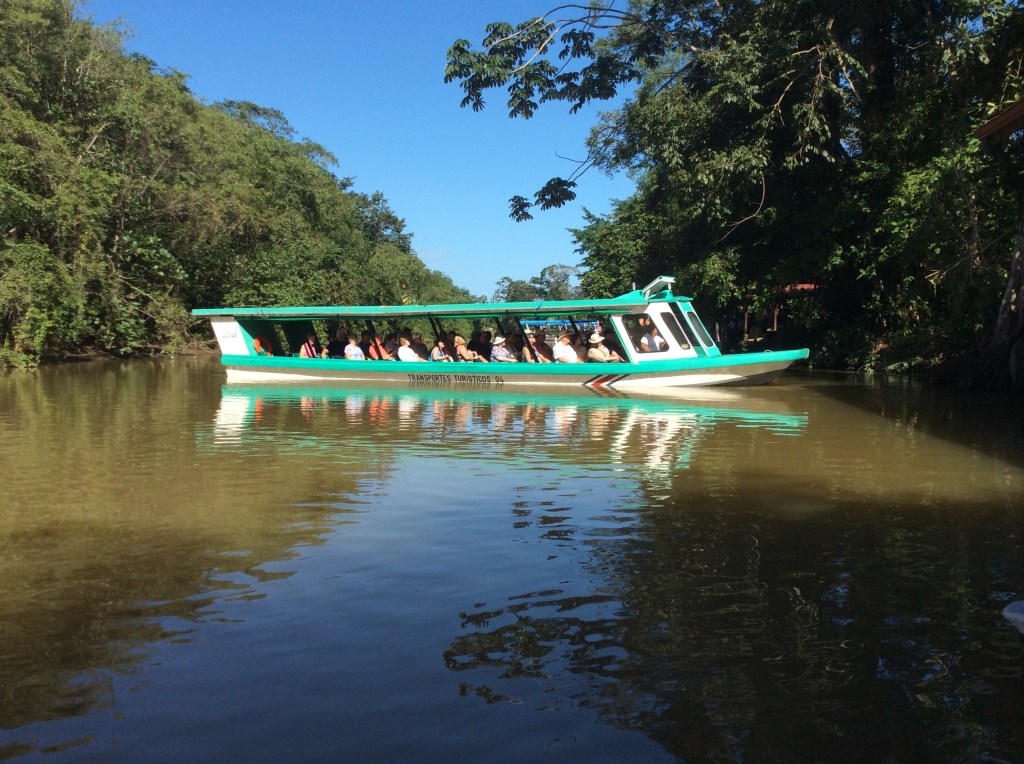 After lunch, our ship pulls alongside in the container port of Cristobal. Other than picking up our returning tour passengers, there’s not a lot else to do here. We do pop ashore to pick up a Panama T-shirt. Surf and turf for dinner – king prawns not lobster tails. Tommy’s on early tonight (1930 – 2115) because it’s Panama party time at 2130. Clocks go back an hour, too, so a chance to catch up on some sleep. Panama Canal to Limon – 192 nautical miles. Friday, 2nd February 2018 – Limon, Costa Rica. We arrive at the port entrance around 0700 and our pilot meets us and escorts us to our berth. Just a container ship for company on our arrival. Our tour is off at 0830 from the end of the pier. And we can soon see how close this town is to the Costa Rican rainforest which can be seen all around us. We’re soon aboard our bus and receiving a warm greeting from out tour guide, Maria (she claims to talk a lot, and is true to her word!). Our first stop is to transfer to our covered boat for a 45 minute cruise on the Tortoguero Canals. And, what an experience. Within a few minutes of boarding we’ve seen two toed sloths, howler monkeys and a variety of water birds. This gentle meander along the waterway is about as authentic a wildlife hide-and-seek as it gets.