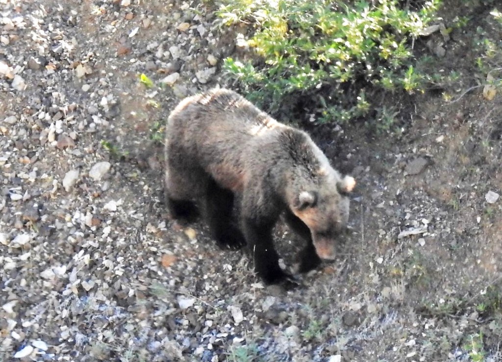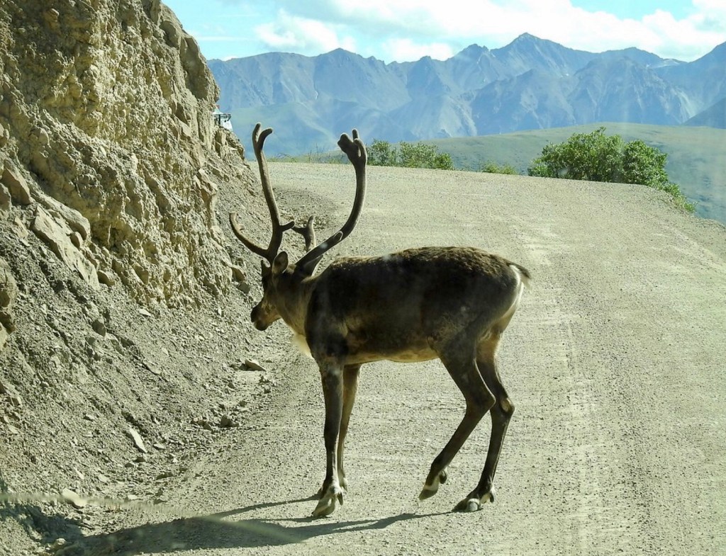 A full days tour in a school bus, goes deeper into the park on to the tundra of the middle elevations. Several portions of the road run alongside sheer cliffs that drop hundreds of feet at the edges. There are no crash barriers. As a result of the danger involved, and because most of the gravel road is only one lane wide, drivers have to be trained in procedures for navigating the sharp mountain curves and yielding the right of way to wild life, opposing buses and park vehicles. On one occasion we got in a traffic queue with a slow moving Caribou who walked down the middle of the road for several kilometres with our bus trundling along behind it.