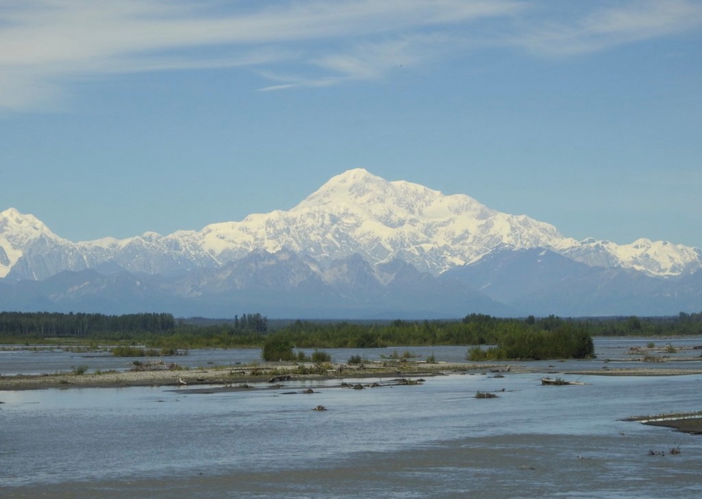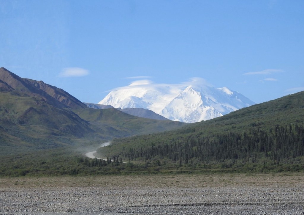 Denali is the highest peak, 20,310 feet high, in North America. It is situated in the central area of Alaska 237 miles north of Anchorage, and 120 miles south of Fairbanks. Mount Denali has a north and south summit. They were both snow-capped at the time of our last visit. However climate change has altered this and suggests that the view we had is unlikely to be repeated.