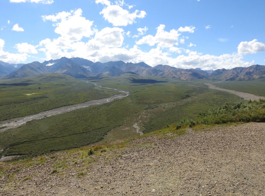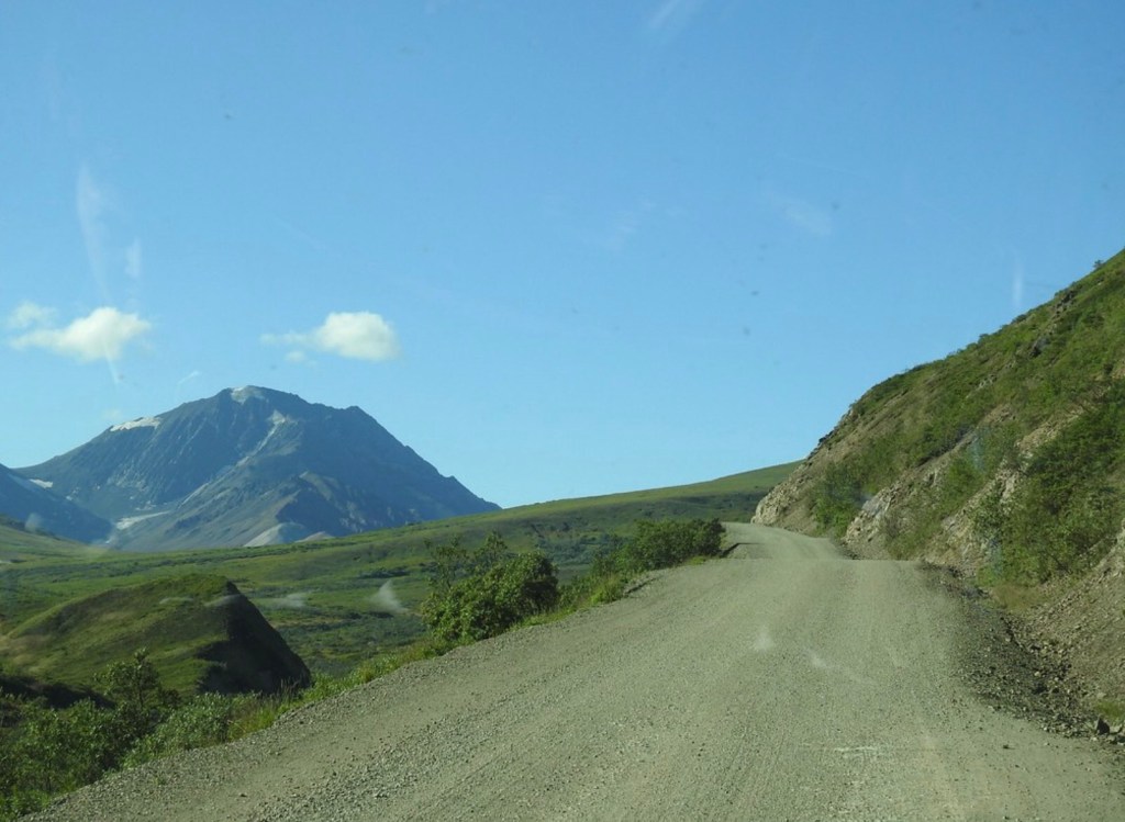 This park road runs north of and roughly parallel to the imposing Alaska Range. Only the start of the road is paved because both permafrost and the freeze-thaw annual cycle would create a very expensive maintenance programme for a paved road.