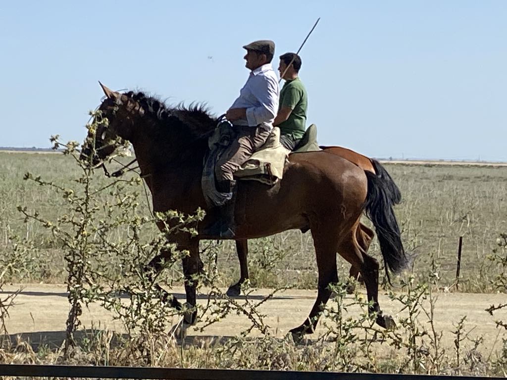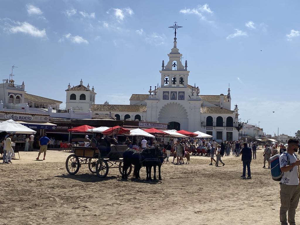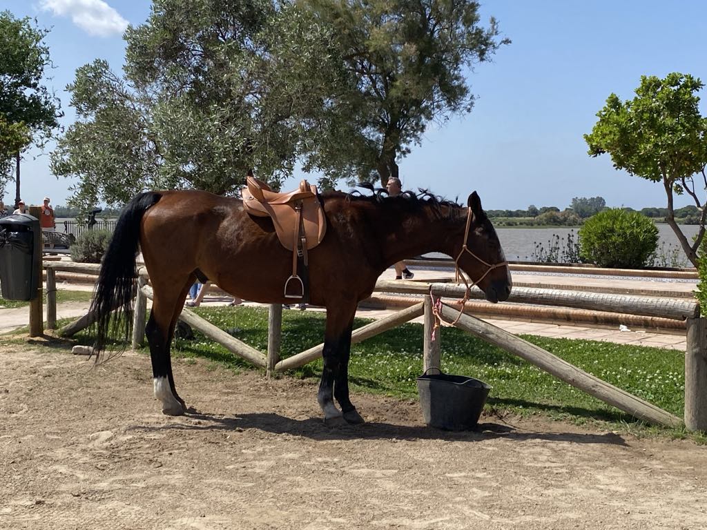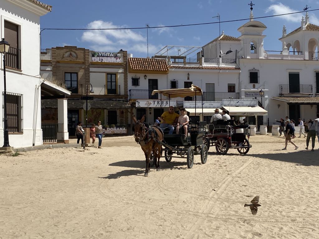 We retraced our steps back to El Rocio. After a little debate on how and which petrol to put in our chariot we succeeded in filling up for €71 ….petrols about the same price as in UK…but we are hybrid so using less. On returning to the hotel we were flabbergasted at what a difference a day makes….we had seen the town as bustling but on a Monday lunch time all the shops were shut. Walking down on to the square there were no horses or carts at all and only 2 of the street restaurants/cafes were open. We selected the one we had, had the rubber frisbee in rather than the one we had, had ham biltong in !!!!! We both went for paella because it would be soft and my gums are suffering from the hard inedible food. I’d stuck to yogurt and a banana for breakfast, so by now I was hungry. The paella arrived with two tiny shell on shrimps, a small strip of calamari, and quite a lot of chunks of meat which could have been goat, horse, cat!!! Who knows….but it was soft and that and the rice were very tasty.