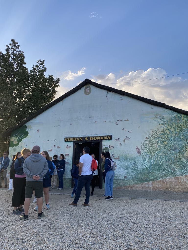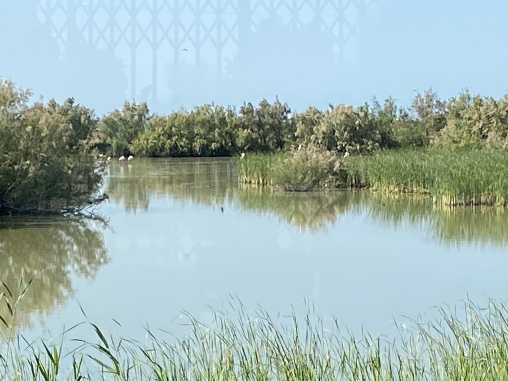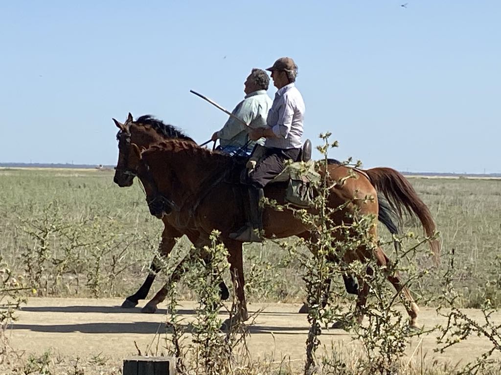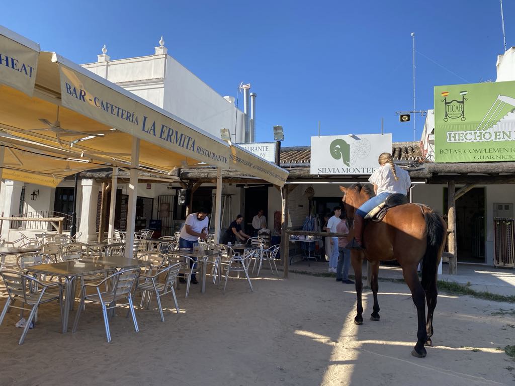 We retraced our steps back to El Rocio. After a little debate on how and which petrol to put in our chariot we succeeded in filling up for €71 ….petrols about the same price as in UK…but we are hybrid so using less. On returning to the hotel we were flabbergasted at what a difference a day makes….we had seen the town as bustling but on a Monday lunch time all the shops were shut. Walking down on to the square there were no horses or carts at all and only 2 of the street restaurants/cafes were open. We selected the one we had, had the rubber frisbee in rather than the one we had, had ham biltong in !!!!! We both went for paella because it would be soft and my gums are suffering from the hard inedible food. I’d stuck to yogurt and a banana for breakfast, so by now I was hungry. The paella arrived with two tiny shell on shrimps, a small strip of calamari, and quite a lot of chunks of meat which could have been goat, horse, cat!!! Who knows….but it was soft and that and the rice were very tasty.