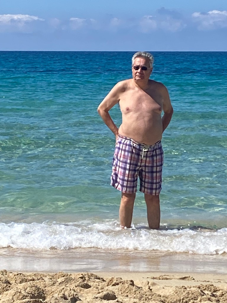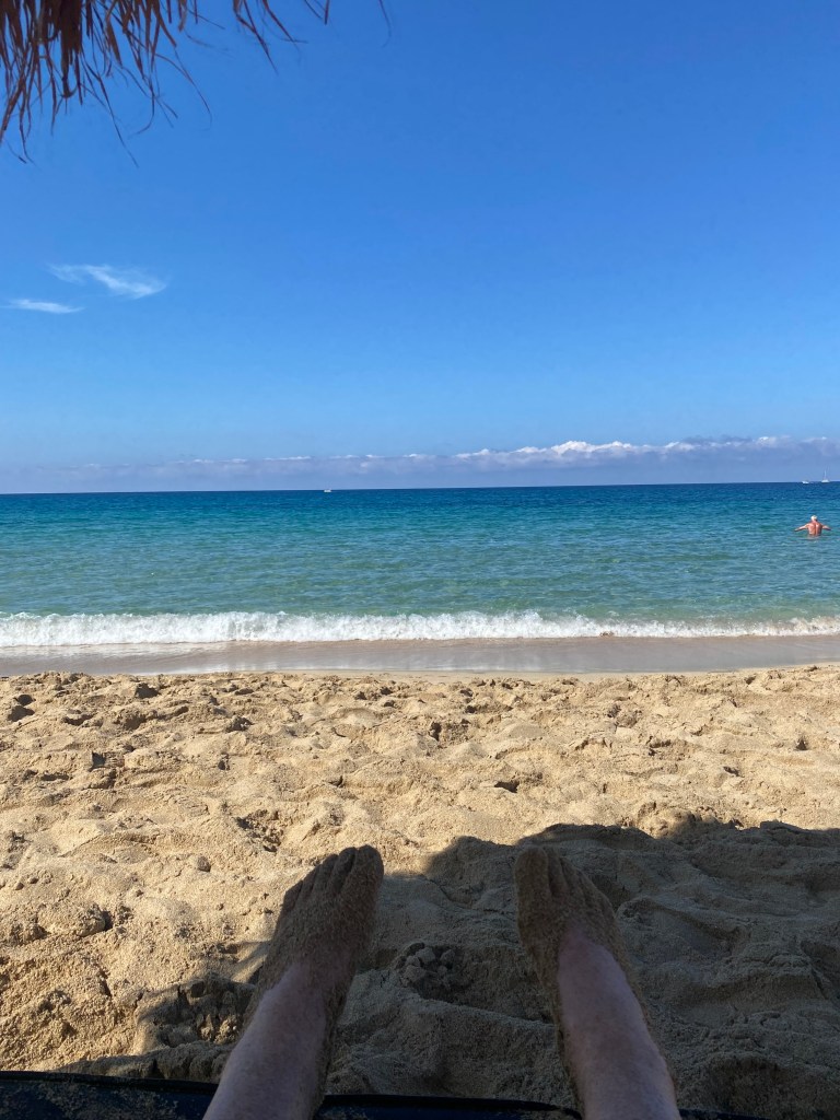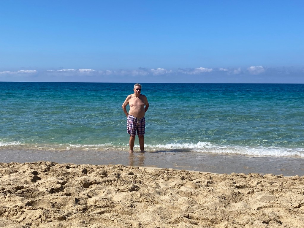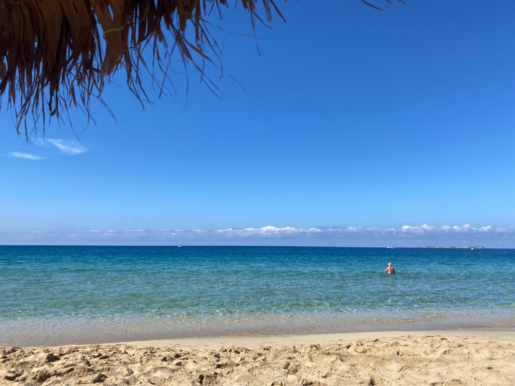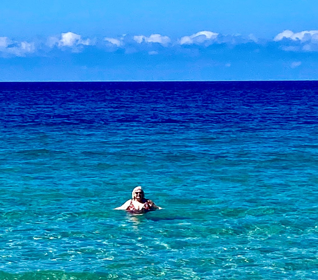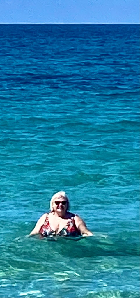 We quickly stripped down to our swim suits and went straight into the sea… a few of our fellow beach goers squealed as they paddled in the cool ripples. But we are British we are made of stronger stuff than that !!! Out we waded and 1..2…3… we were in…. It was lovely , only taking seconds for our bodies to acclimatise to the temperature of the soothing sea… we swam, bobbed about and enjoyed the submergance.