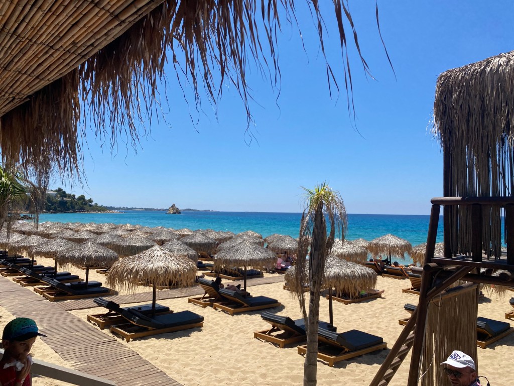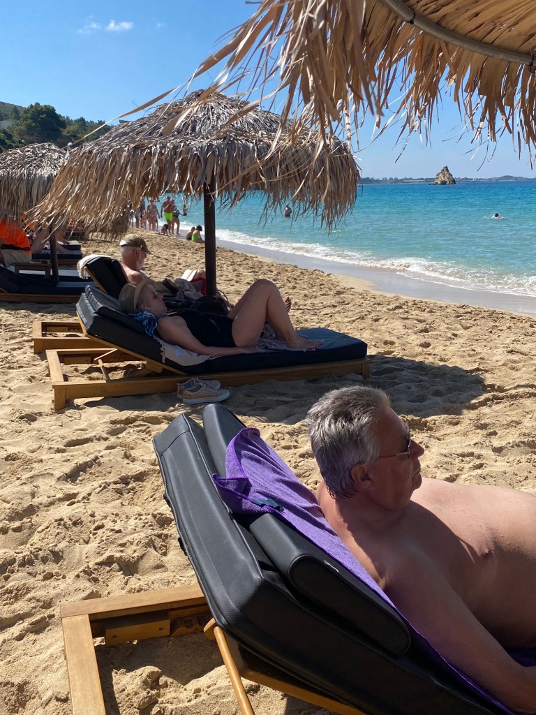 Today is our beach day…. I just love swimming in the sea so I am like “tigger” bouncing and bounding around. The coach took about 20 minutes to get to an area above a Sandy beach resort. It was Makris Gialos Beach and the beach facility was called Costa Costa beach. The track was quite steep and wound down onto a lovely yellow Sandy beach. Two loungers and a parasol were €30 , which we willingly paid…