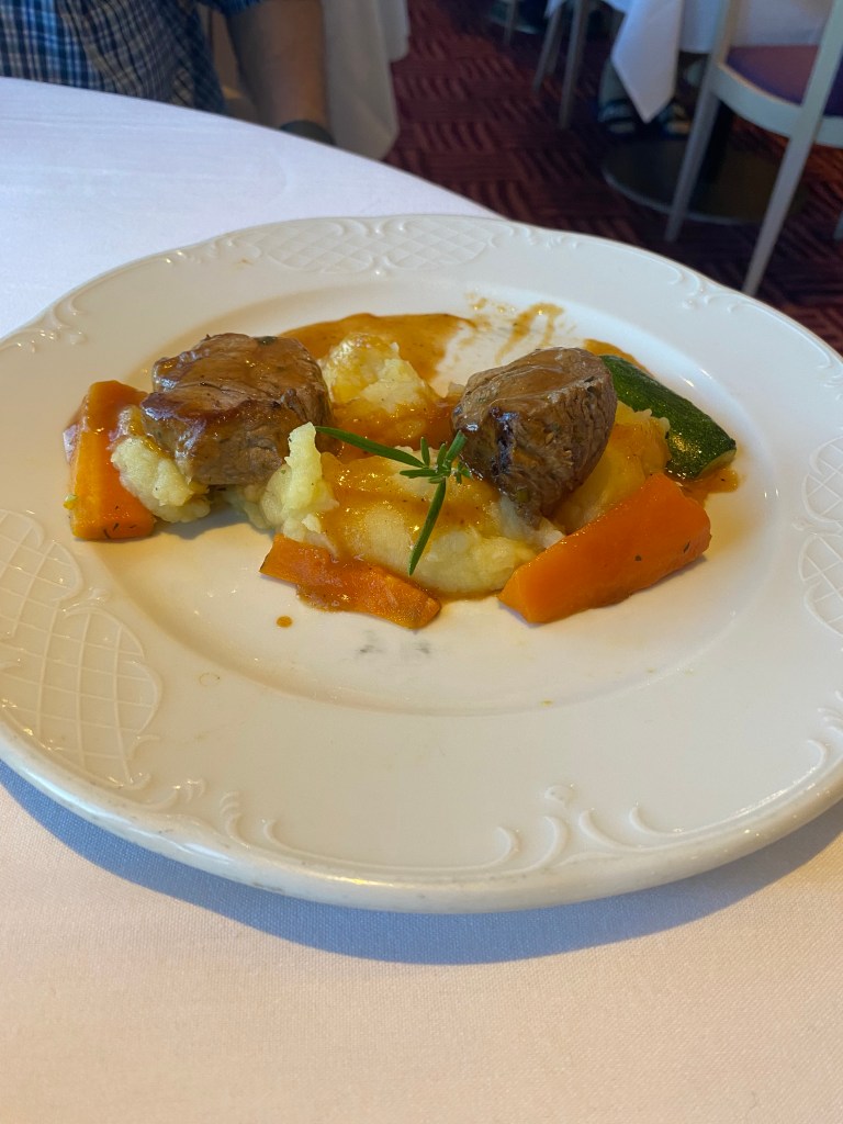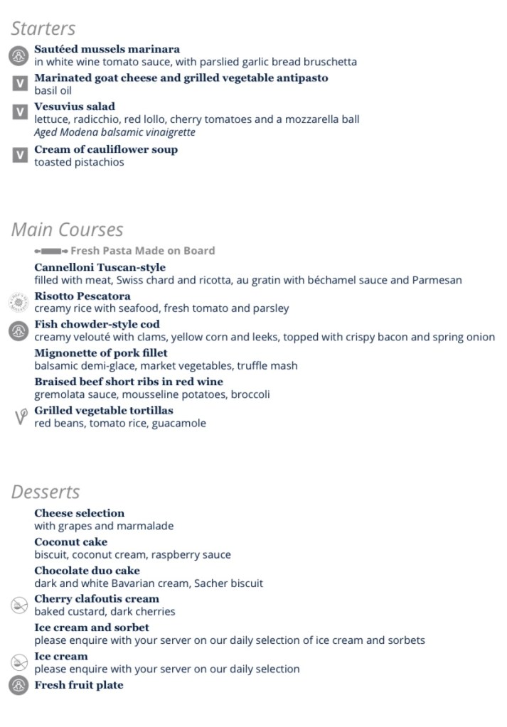 Having completed the task, dried hair, ‘booted and suited’ we headed for the dining room…. Once again we had a wake view in Salem’s area. A nice menu allowed for a pleasant meal.