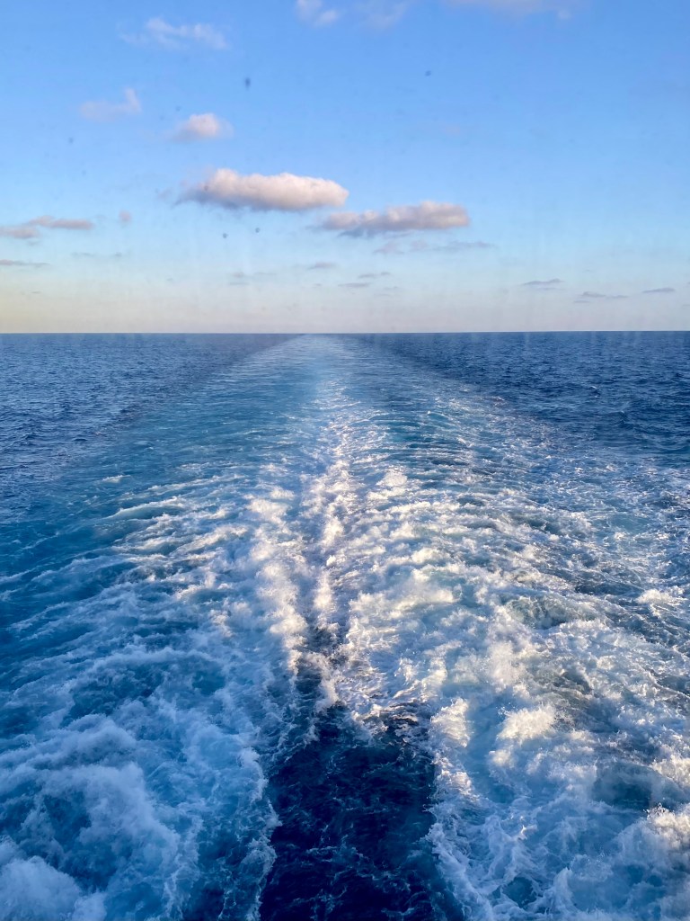 We woke up very early 3.00am ….Uk time was 7.00 am body clock all adrift! After the necessary trip to the bathroom we both managed another long sleep and finally made it down for breakfast at 9.30am…USA time. We used our new skill to call another Uber and for $45 he took us to the port…dropping us at pier 21 to embark on the Enchanted Princess. Wow!!!… to say we were amazed is an understatement…the queue for the terminal went right the way to the end of the pier and back around again. It took us an hour to join the end of the queue and another hour and three quarters to embark on the ship…nearly 3 hours most of it queueing in the hot sun….come on Princess that is not good enough…..they should have allocated embarkation time slots like they used to, so that customs scanning doesn’t get overwhelmed … the actual embarking with Princess staff and getting our medallions was only a matter of minutes. After dropping our carry-on bags off in our cabin…..an obstructed view balcony especially selected as it looks over the middle of the roof of the lifeboat…so I can’t look down and feel seasick…..there is always method in my madness!!! ….we hotfooted it up on to the sun deck for a Key West Cooler mocktail…”Cheers everyone!” And a light lunch – hummus, pitta bread, olives salad. Followed by fresh melon and pineapple…….lovely….two glasses of water and we are ready to fight the crowds for a slot on top deck to watch the sail away……..The usual array of singing, dancing, shouting, cheering, the “love boat tune” played on the ships horn and the pilot boats guided us out of the port 50 minutes late but yeah!!!! We are on our way.