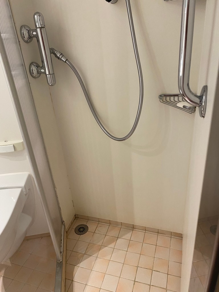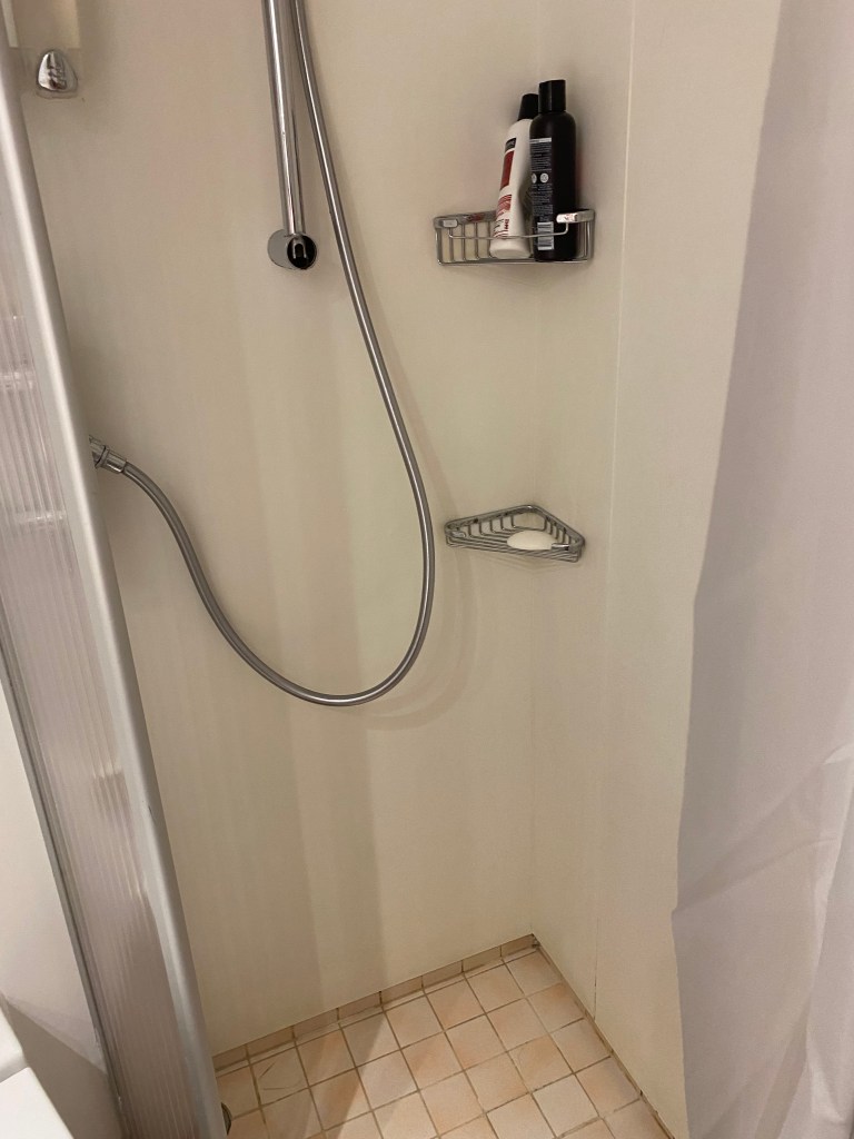 Now let me tell you about the shower … it is a sort of triangle with the longest straight side being about 2 foot and the other straight side being about 18 inches. To wash one’s hair you need to stick your head in the corner under the water meaning your derrière pushes itself out and becomes shrouded in the shower curtain. The opposite happens when you wash your derrière with your head pushed against the shower curtain… it really would pay to be a contortionist… if anyone has found an easier way to use this tiny shower I am open to ideas!!!!