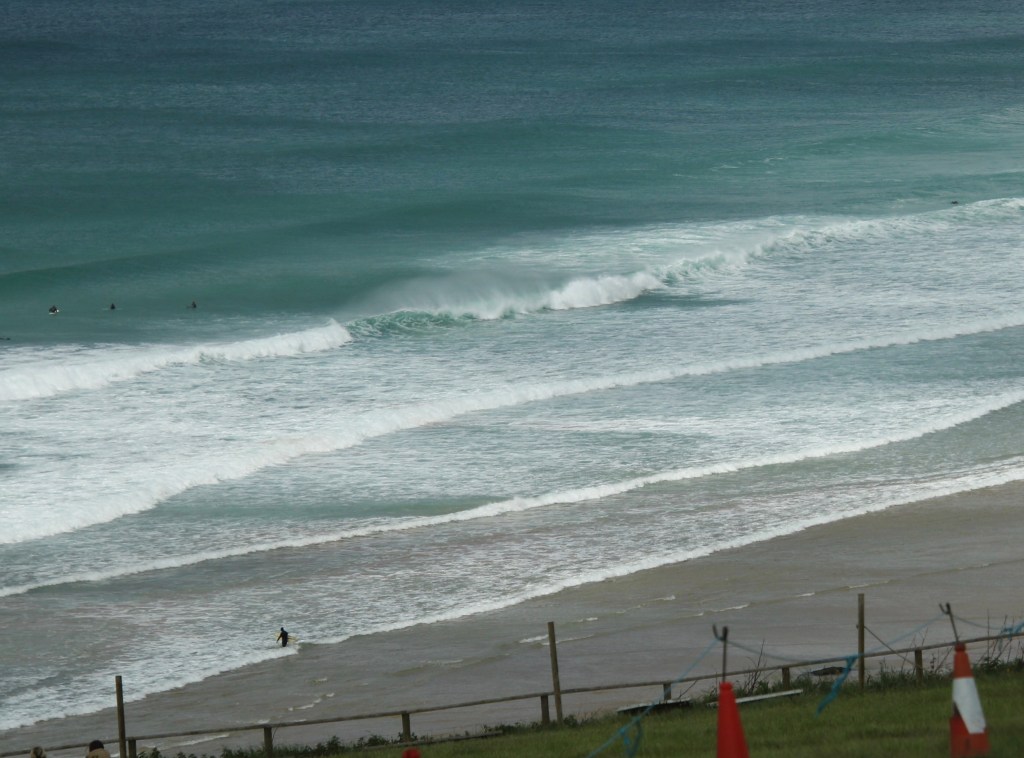 I did wonder where we were off t. We passed a couple of cars coming the other way, a small shrine, a couple of crofts and a few dilapidated buildings before coming to some mudflats. I hesitantly drove on, and on, and on….after all the road was wide enough to do a 12 point turn!!! So I wasn’t going to have to reverse for kms! We caught up with a car in front who was also hesitantly driving. Suddenly we cane on to a newish piece of two lane tar road…wow…the bone rattling stopped. About a km later we turned a corner and wow…wow…wow….the most magnificent bay of pristine white sand…..and a very well layer out carpark and a cafe with viewing deck…..my goodness what a surprise. There was a surf school giving beginners lessons at the far end of the bay and at the end of the where the cafe sat was some black spiky lava like rock….it reminded us of “Hell” on Grand Cayman Island in the Caribbean.