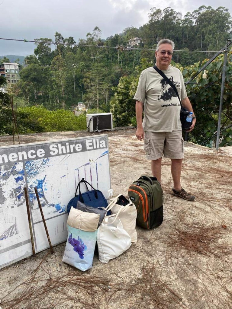 We got to Ella about 4.15 pm, about an hour late. Suminda had been patiently waiting for us for about 4 hours as the trip in the car is so much quicker…but the train is a real ‘ must do’, something not to miss as it really shows the real beauty of this country. Suminda took us to the bottom of a hill and called our hotel ( perhaps I should put that in inverted commas with a few exclamation marks and a lot of laughing faces). The hotel sent a tuk-tuk down to take us up as the road was too narrow for a car. We pilled an overnight bag and a few bits into the tuk-tuk and up we went. It was very steep and after about 100m the tuk-tuk turned a sharp right and told me to get out saying “next bit one, by one”. So out I got and found myself standing in the middle of nowhere all on my own. What seemed like an eternity later it appeared again and told me to get in….after a very steep climb it pulled off on to what could only be described as the flat roof of an unfinished building. In the middle of this flat roof was a very faded sign saying Eminence Shires Hotel…. I looked around absolutely no sign of John or a hotel….beginning to panic I asked “where is the hotel?” And the driver pointed to a set of metal steps not quite as steep as a step ladder at the side of the roof leading down. As I went over to have a look John appeared at the bottom. There were 3 rooms with full length glass windows and a door, a small patio with two chairs and a table outside each door. The couple on the patio next to ours had been on the train sitting behind us. We were greeted with a welcome drink, shown our room and the “receptionist”!! Booked us a table at his recommended restaurant The White Rabbit. The view from the patio was superb, we could see a beautiful waterfall and the railway line.