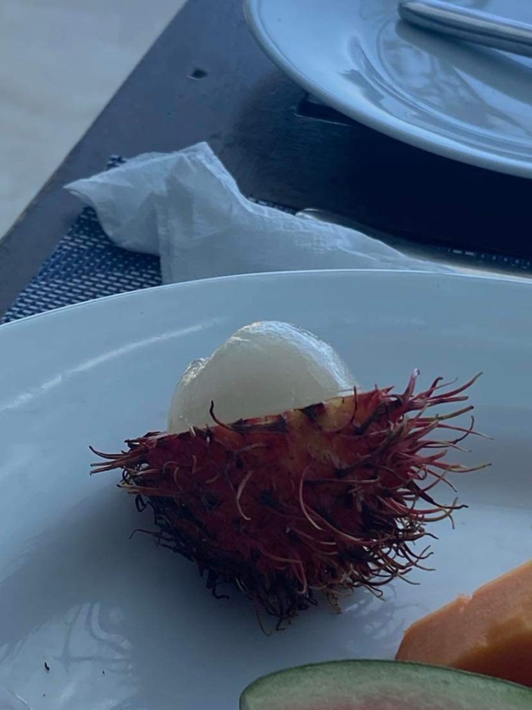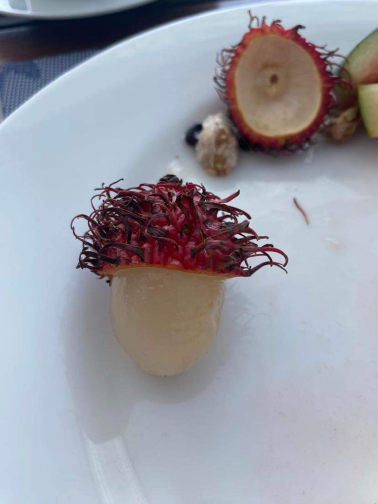 The waters were much calmer on our return and the crew brought some fruit around. This time we accepted, as it was 15 hours since we’d last eaten and we were both rather peckish. We docked at 12.20 to find Suminda patiently waiting for us. Our itinerary said we were going to see the stilt fishermen today. However, it is a Full Moon day, which is a Sri Lankan holiday and Suminda wasn’t certain anyone would be fishing so we agreed to go tomorrow on our journey to our next hotel. We stopped at an ATM on the way back to our hotel. We were running a bit short of SLR ( Sri Lankan Rupees) and it seems easier to use the machine than to find somewhere to change US$’s.. unfortunately this machine charged SLR 800 ( approx £2) for the withdrawal……but hey ho!! We were financially sound again. When we got back to Sea World Botique our breakfast table was still laid, as promised, and our full breakfast was provided the same as the previous day, although today we also had some rather scary looking fruit which tasted lovely, known as rambutan. It was very similar in taste to a Lychee.