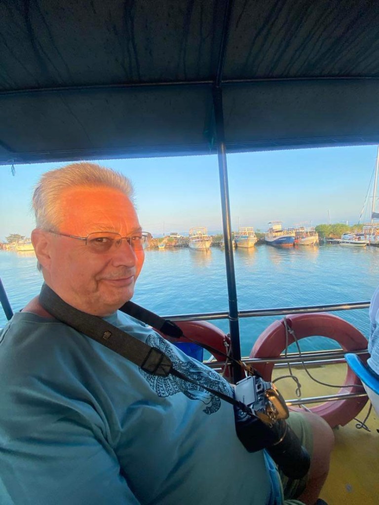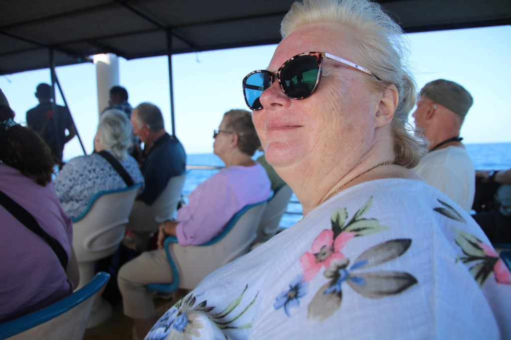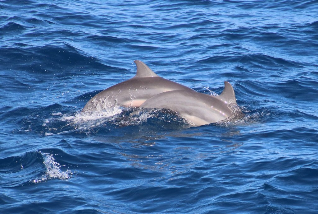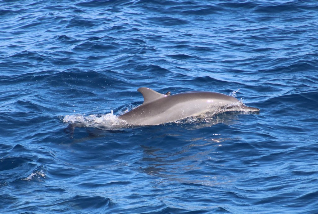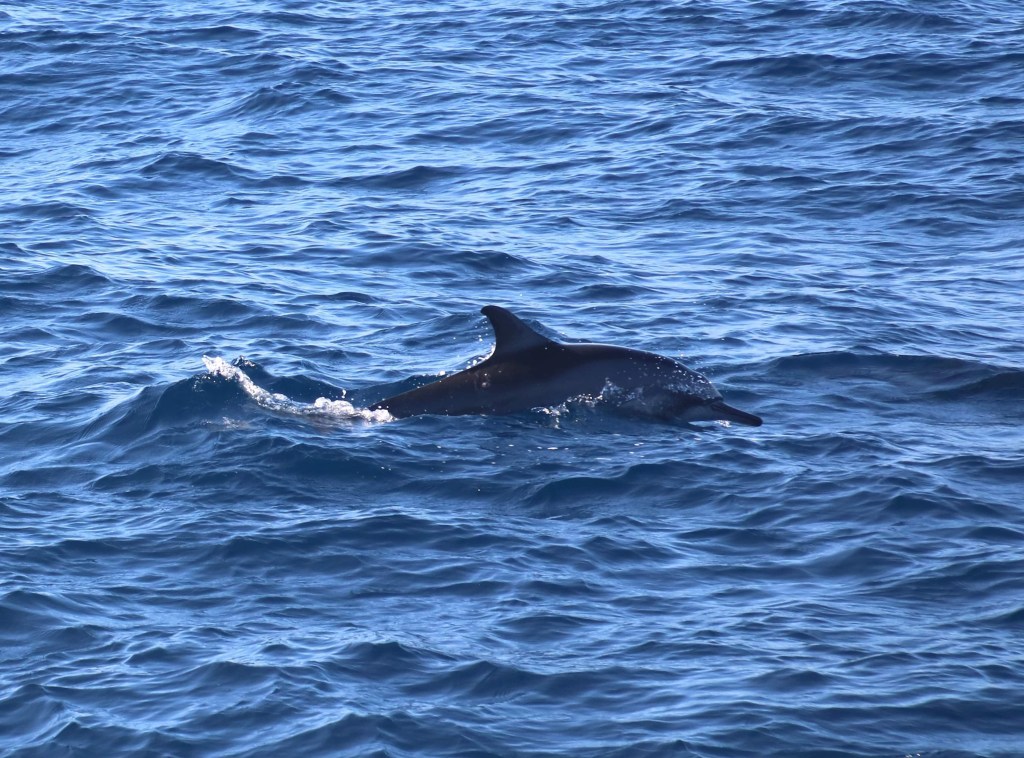 I was immediately very pleased that I had decided to take half a Kwelles ( sea sickness tablet) before leaving the hotel….it was a risk because they often make me a bit doopy and unsteady on my feet…but as John said cheekily that he probably wouldn’t notice the difference, I risked it. Thank goodness I did..it was very rough with deep peeks and troughs and a few people began to feel unwell. I kept my bottom on the seat and my eyes peeled on the horizon and although we both turned down the breakfast which was offered we both managed without incident. We had been going about an hour when we saw a small pod of Spinner Dolphins. Another hour passed and this time we encountered a much bigger pod…they were really performing by jumping out of the water pirouetting and diving back in. They looked much smaller than the bottle nosed dolphins we are used to seeing in various parts of the world. Their small size made them even cuter.